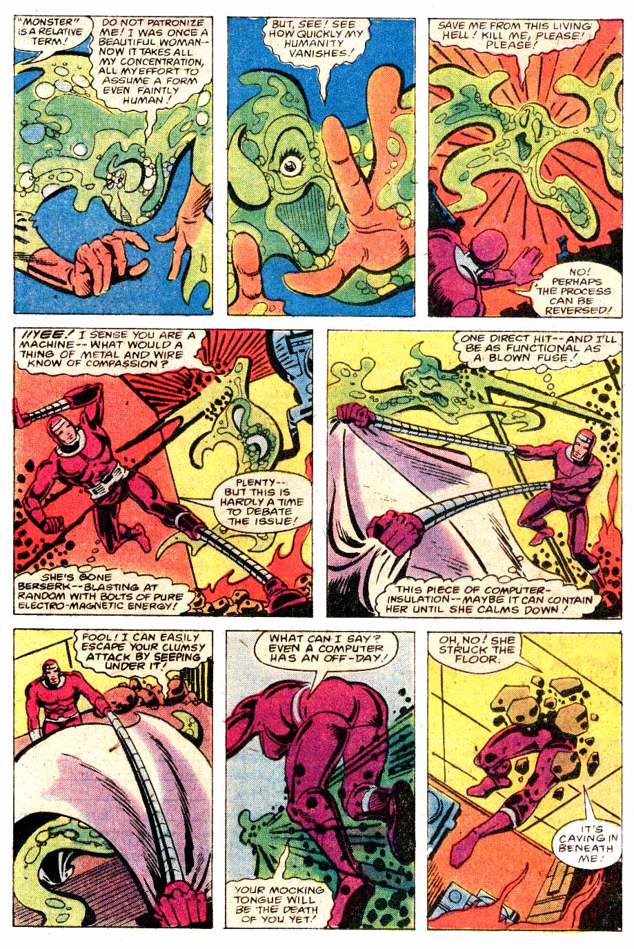 Synopsis: Machine Man 15 was written by Tom DeFalco and drawn by Steve Ditko and opens with Aaron (Machine Man) Stack getting himself ready in the morning, along with his room-mate Peter. At Aaron’s job at Delmar Insurance, colleagues Pamela Quinn, Eddie Harris and Maggie Jones talk about Aaron as if he isn’t there, before the company boss calls for Aaron to his office. At the Alternative Resources Centre, prickly physicist Dr Violetta Todd is failing in her attempt to create a new fuel and since this is a comic, there’s an accident.