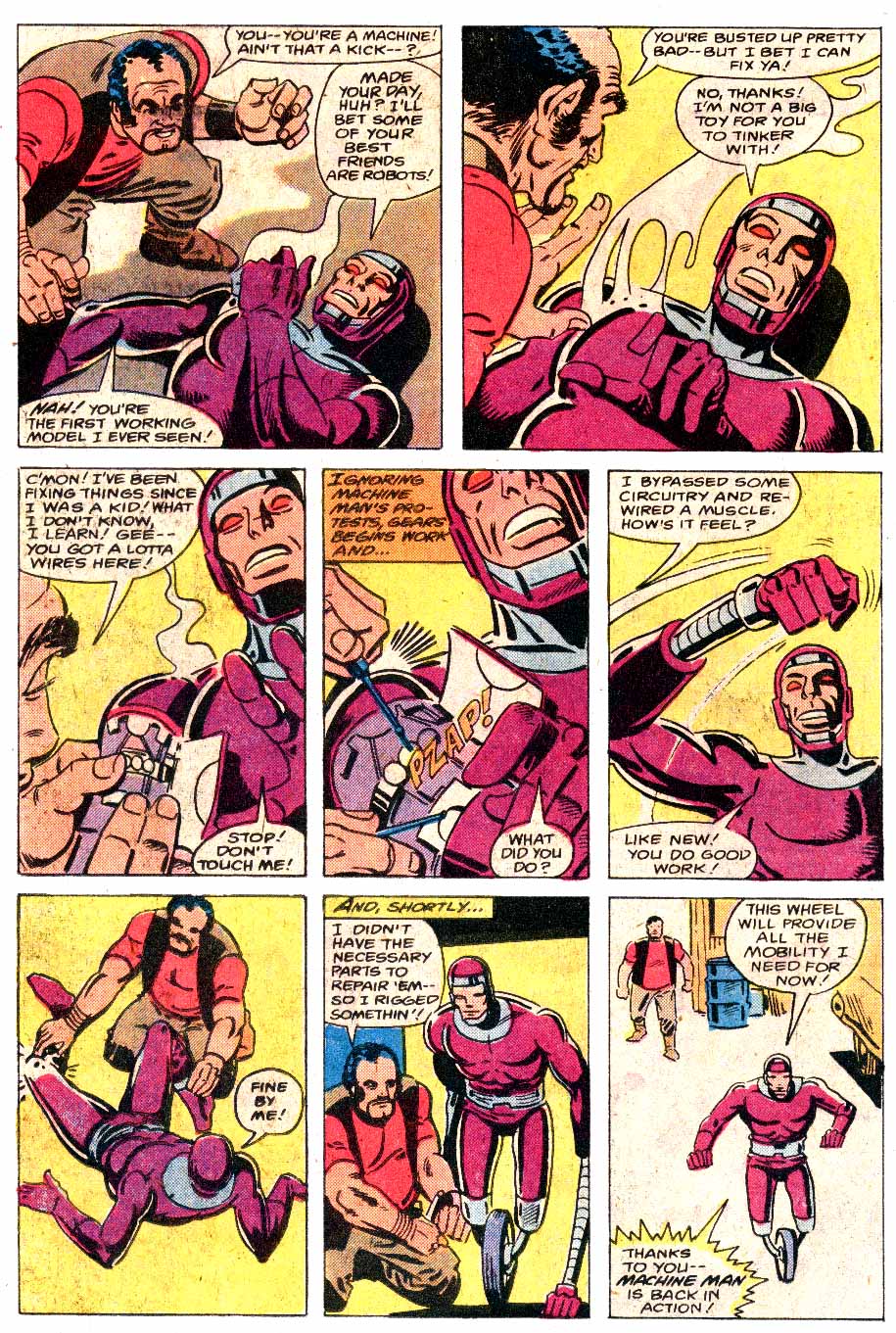 This is where Aaron comes in as he is send by the boss to assess the damage and see what help Delmar Insurance can offer. Seeing the blazing fire, Aaron changes to Machine Man and flies in to find survivors. There are some and he saves them, but in doing so shows that he is mechanical in nature, this is not taken well. Machine Man then finds Dr Todd, who is now some kind of gaseous electro-magnetic being, who refers to itself as a monster and becomes enraged when Machine Man debates that. The former Dr Todd (who is later referred to as Ion, by the police for NO APPARENT REASON) attacks Machine Man, hoping that he will kill her and end this mockery of life she has left. Machine Man escapes, critically damaged and finds his way to a local autoyard, where he is found by mechanic ‘Gears’ Garvin, who despite Machine Man’s attitude, helps him repair his arm and replaces his broken leg pieces with a single wheel, giving him mobility.