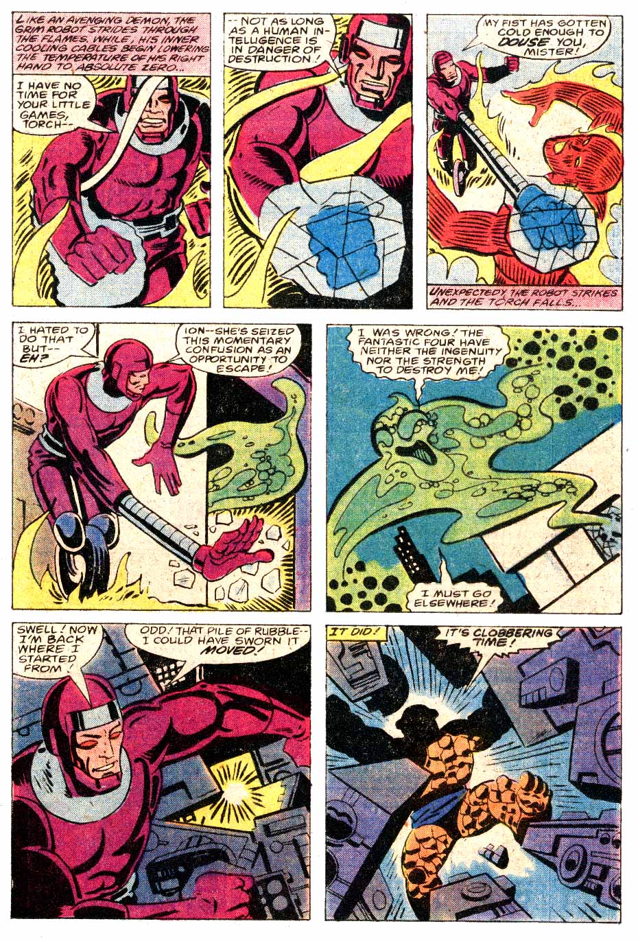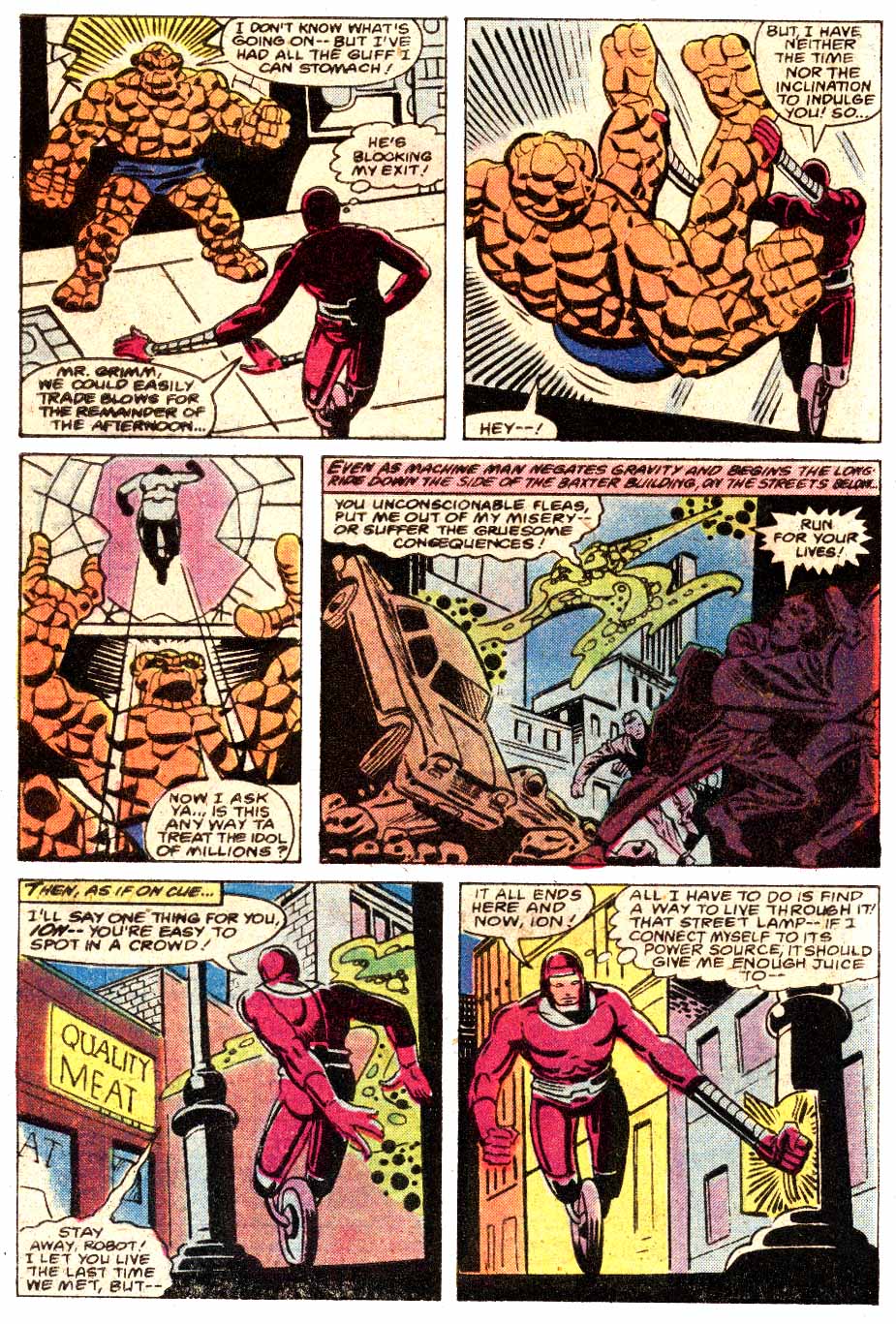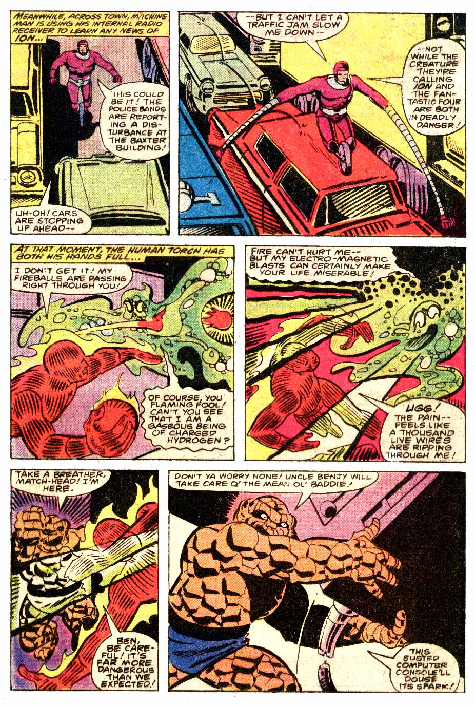 Meanwhile Ion (really, didn’t call herself that at all) is on her rampage to be either killed or cured and ends up at the Baxter Building, home of the Fantastic Four, with two of them Benjamin J (The Thing) Grimm and Johnny (Human Torch) Storm, who get into a battle with the creature and when Machine Man follows the police reports and debris to the fight, is also attacked by the two of the four, because it’s comics.