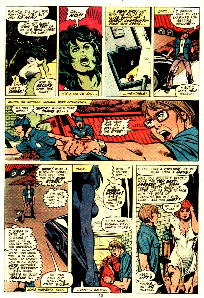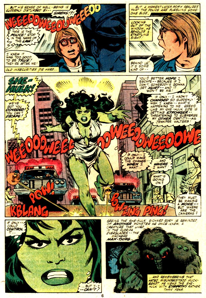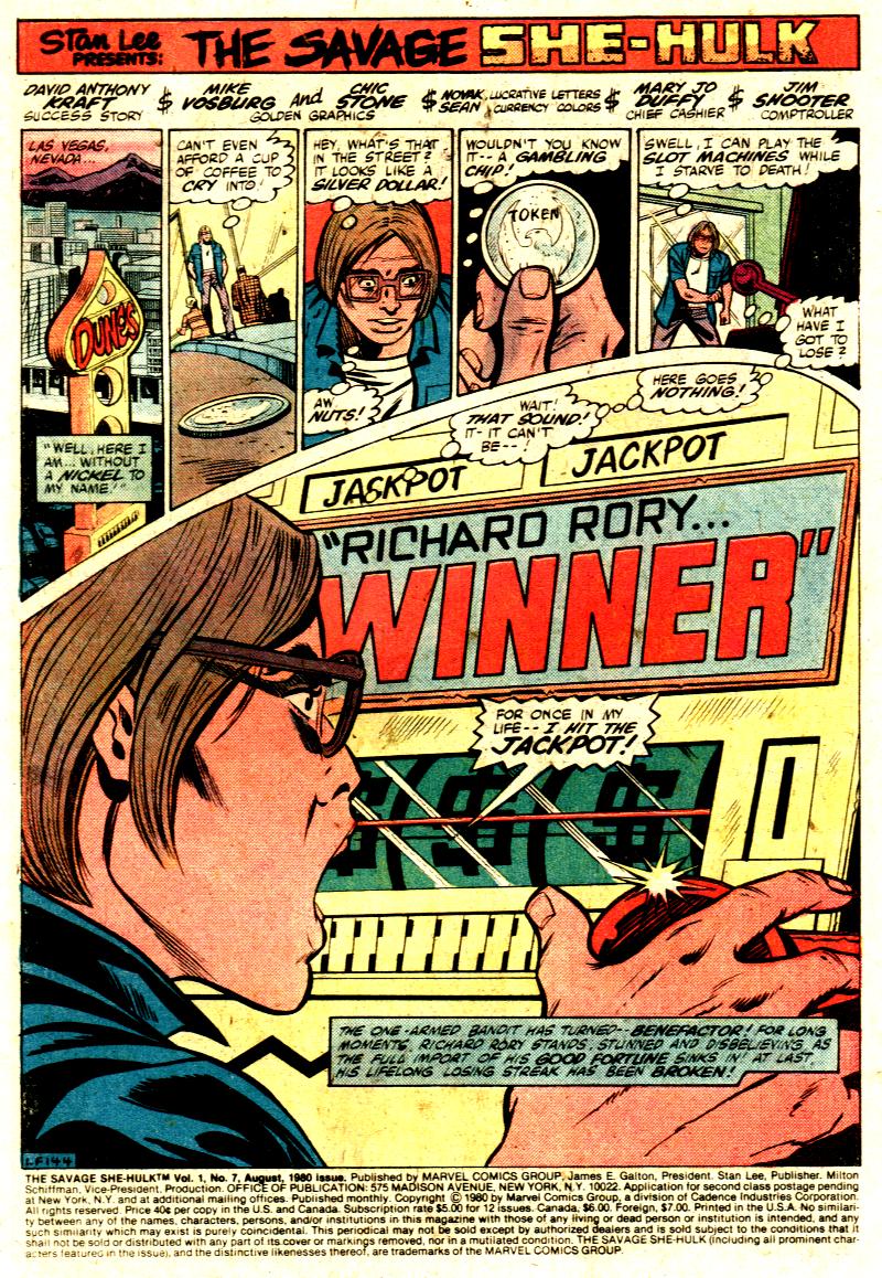 Synopsis: Savage She Hulk 7 was written by David Anthony Kraft, with art by Mike Vosburg and Chic Stone. It opens with Man-Thing supporting character and all-round bad luck sufferer Richard Rory having a run of good luck, he wins $50,000 on a jackpot machine and then bets that on roulette, leaving him with $1,500,000. After getting a Rolls and driving to California, Richard comes across Jennifer Walters (in her She-Hulk form) being chased by police, who are still wanting her in questioning for murders during her first appearance. Richard directs the police away from the alleyway She-Hulk hides in and when he goes back to see her, she has returned to her Jennifer Walters form and simply avoids the whole green woman thing. Richard offers her a lift, she declines, being close to work, he takes that as a shutdown and Jennifer decides to go out with him that night.
