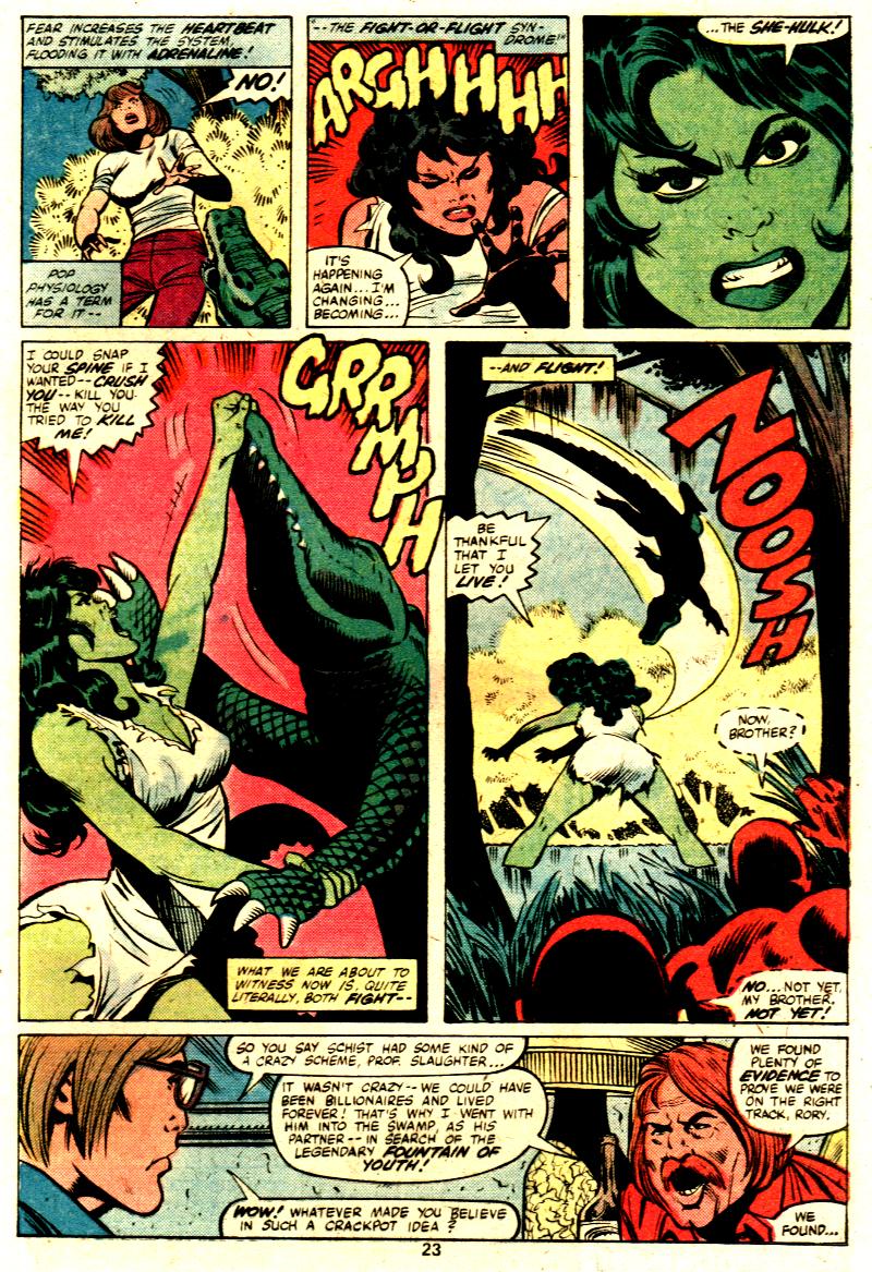 She changes at the office and the two drive around all night just talking. Richard tells his life story amd Jennifer listens and in a tender moment between them, she kisses him. After this date, Richard decides California isn’t for him and returns to Citrusville, Florida and buys the radio station that once fired him. He then plans to buy part of the swamp that the Man Thing lives in, so he is left alone. That doesn’t go too easily, given that the owner has disappeared. Meanwhile Jennifer decides to look at the land, after an alligator chases her, she turns into She-Hulk and throws it back, observed by reddish purpled skinned men. Richard finds Prof Slaughter, one of the last people to see the lands owner F A Schist and they talk about Schist and Slaughter trying to find the legendary fountain of youth, only to find these purple ogres and a spanish settlement in the swamp called La Hacienda. The purple men now attack She-Hulk and to protect the secret of their existence and they can’t stop her, until they use a potion to make her sleep. They carry her to La Hacienda and place her in a tube to be bathed in the waters and become part of that community, whether she wants to or not.