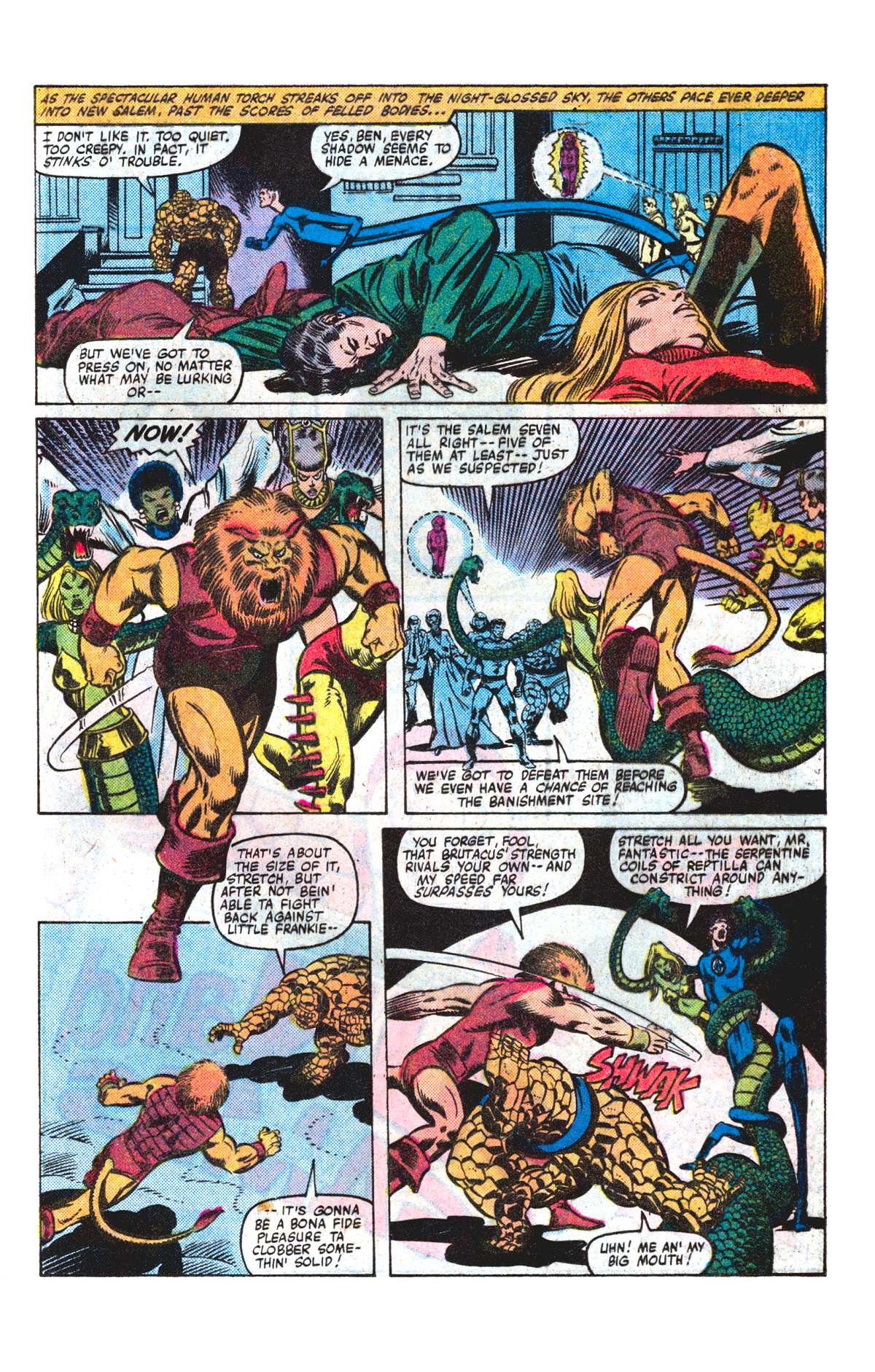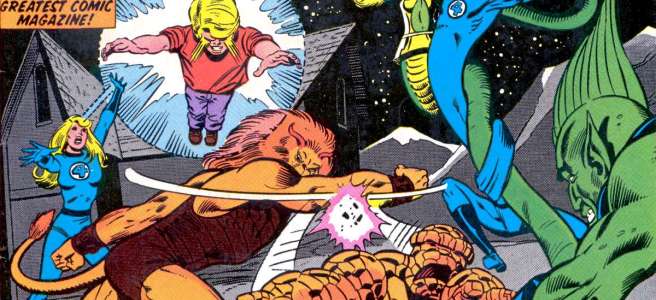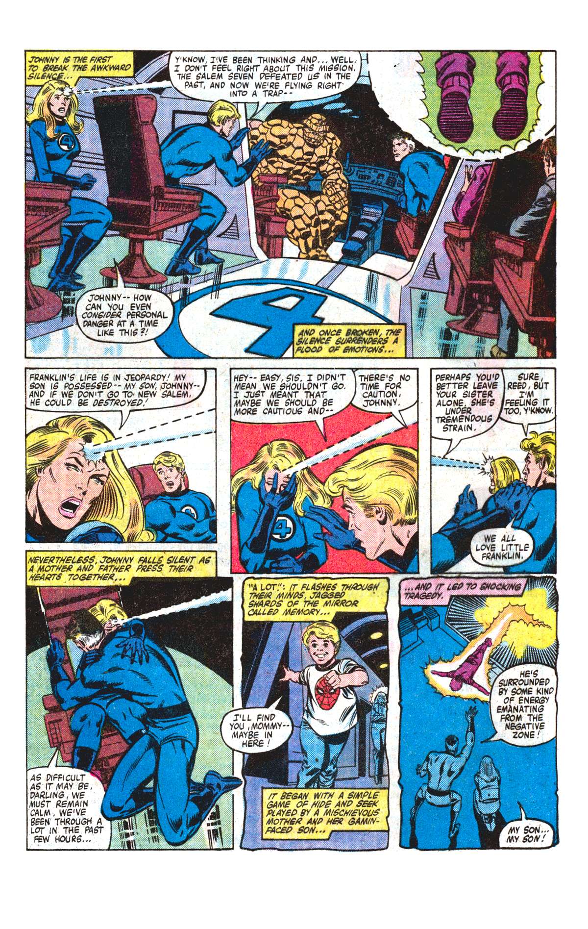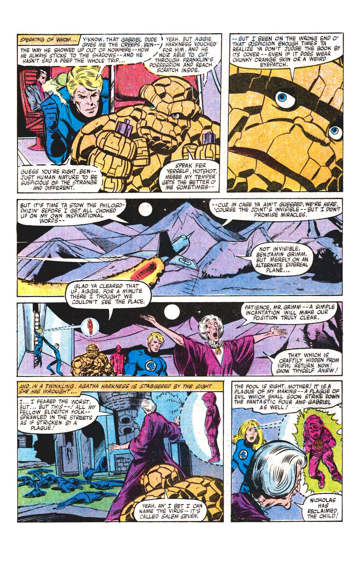 Synopsis: Fantastic Four 223 was written by Doug Moench, with art by Bill Sienkiewicz and Joe Sinnot, opening with the Fantastic Four (Dr Reed ‘Mr Fantastic’ Richards, Benjamin ‘The Thing’ Grimm, Susan ‘Invisible Girl’ Richards and Johnny ‘The Human Torch’ Storm) in the group’s pogo plane, heading towards the town of New Salem. Also on board are a devil hunter called Gabriel, former nanny Agatha Harkness and Franklin, Reed and Sue’s young son, who just happens to be currently possessed by Nicholas Scratch, the demonically powered son of Agatha Harkness.