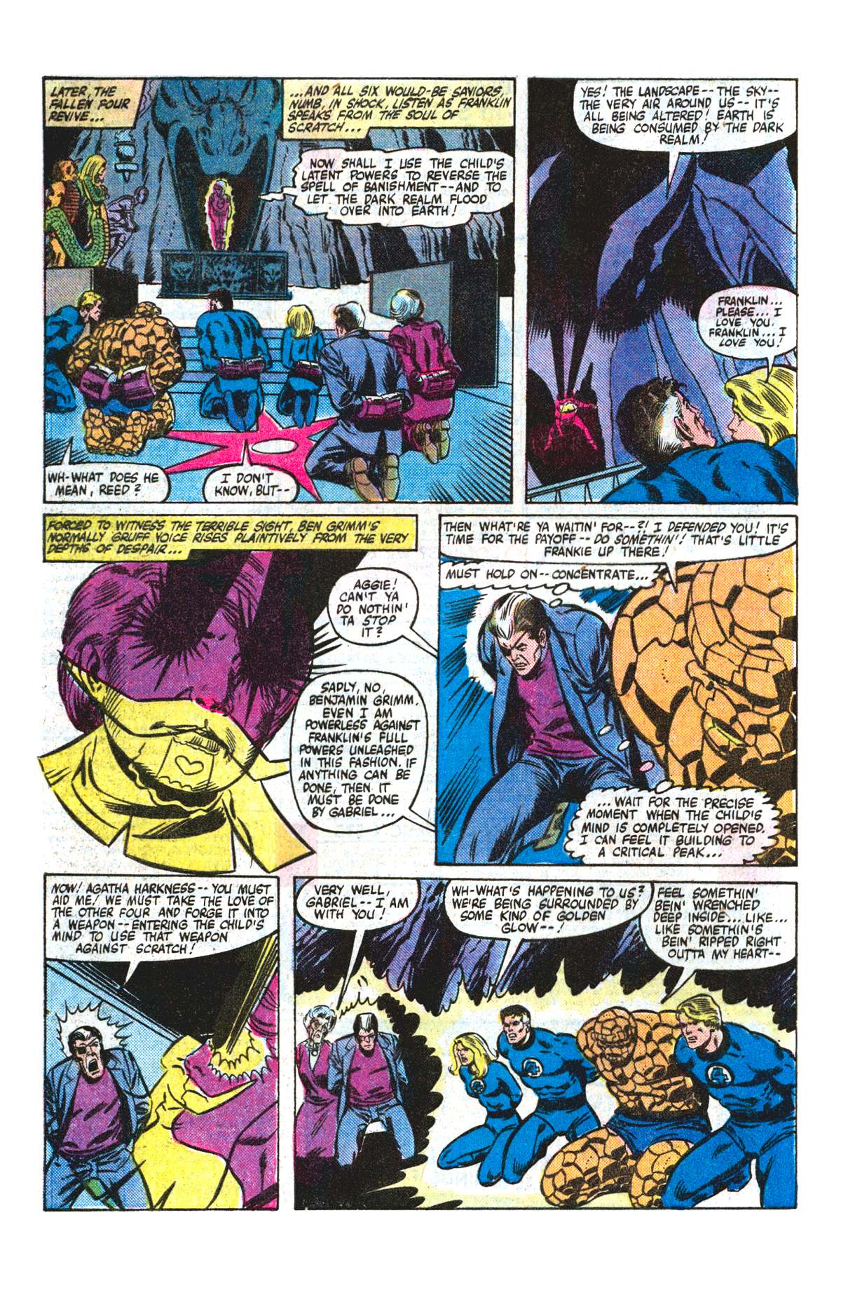 In New Salem, the magically powered Salem’s 7, rail against their being trapped, but are freed by the disembodied Nicholas Scratch. The Fantastic Four and guests arrive at New Salem and find the Salem’s 7 have taken over the town and unprepared, the Four, Gabriel and Agatha are captured after a brief battle with the 7. Bound and held before Scratch in Franklin’s body, the team watch as Scratch tries to use the latent power of Franklin Richards to open a gateway and allow Scratch as well as the whole dark realm to enter the world. Gabriel sees his chance and convinces Agatha to bring the minds of the Fantastic Four into Scratch’s mind and defeat him from within.