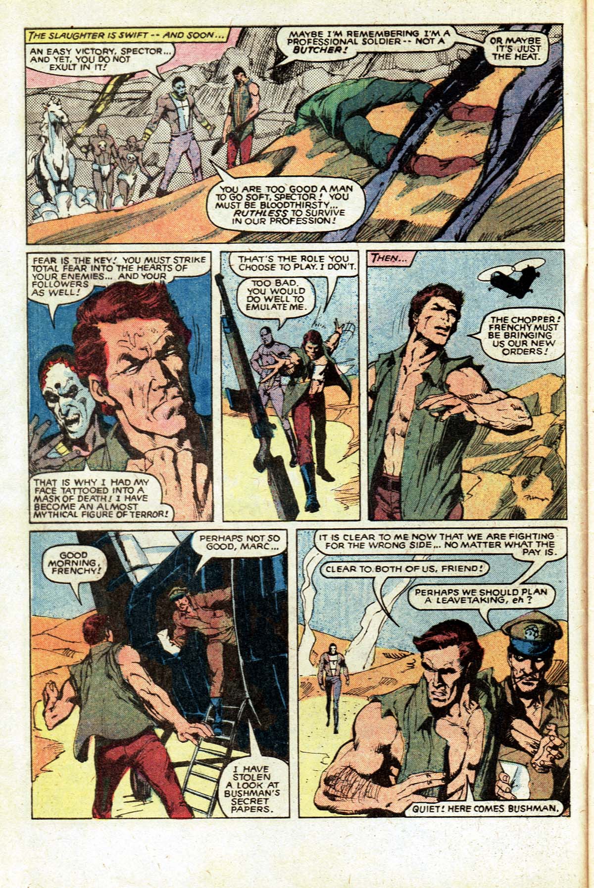 Declaring Khonshu to be the god of the moon, the taker of vengeance, he stands and finds a nearby white sheet and fashions it into a cowled cape and goes off into the desert, declaring himself to be the moon’s knight of  vengeance. He attacks Bushman’s camp, killing each and every member of Bushman’s army, save the Bushman himself, who escapes as Frenchie (the other survivor) catches up with Marlene. With Bushman gone and Frenchie and Marlene safe, Marc Spector leaves the desert to begin the next phase of his life, as Moon Knight.
