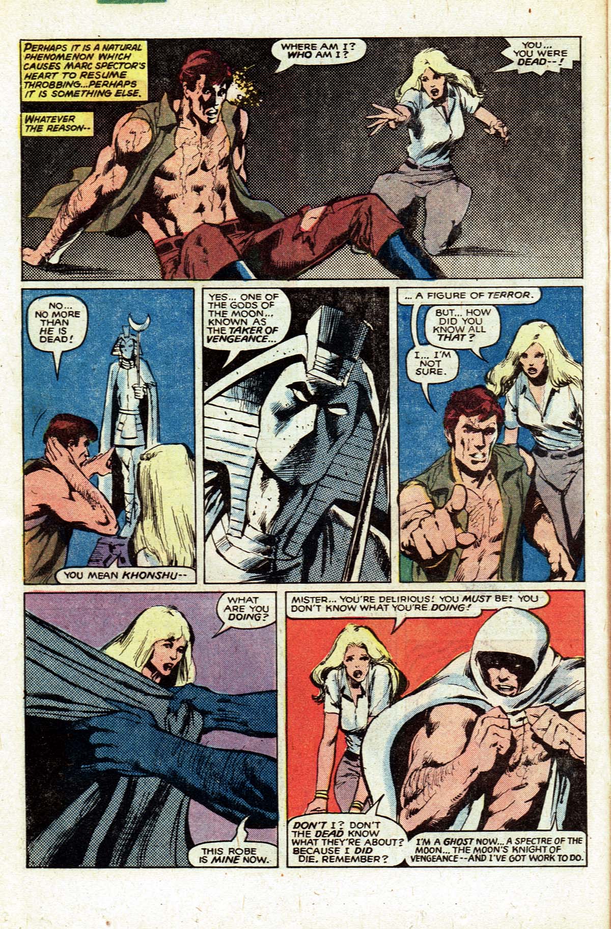 Hours pass and a near dead Spector is taken to a nearby ancient temple by some locals at the request of Marlene, the lady that Spector spared earlier and he is laid to rest in front of a stone statue of the Egyptian god Khonshu. He is thought dead, but under the moon light and in the shadow of the statue of Khonshu, Mark Spector wakes.