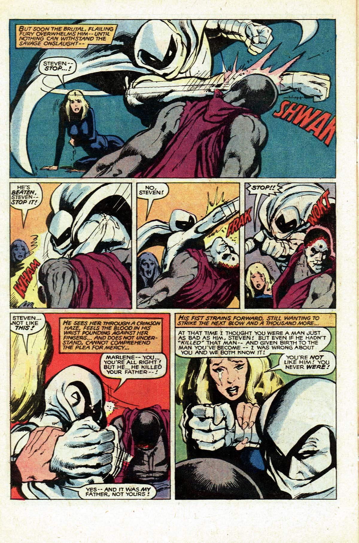To protect Marlene, Moon Knight viciously beats him, but after Marlene stops him, he falls short of killing him, to remember that he is a man, and should not abuse the power of this new life.