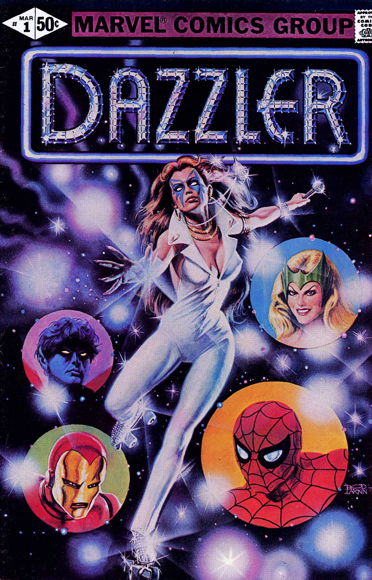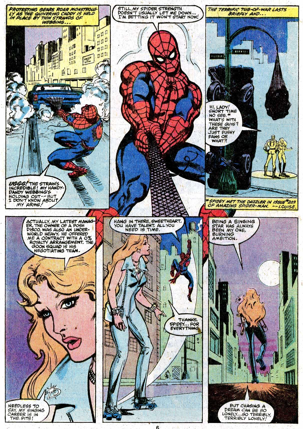 Synopsis:Dazzler 1 was written by Tom DeFalco and pencilled by John Romita Jnr, with inks by Alfredo Alcala and opens with Alison (Dazzler) Blaire running from a gang of thugs. Cornered in the alley, she puts on her roller stakes and switches on her minature radio and uses the sound from it to generate a powerful light show with her mutant powers. One of the thugs fires wildly and the ricochet trashes the radio. Without more ambient noise, Dazzler’s powers aren’t really much use and the thugs advance, only to be stopped by a passing Spider-Man, who hands the thugs a more comprehensive beating. Dazzler thanks him, but points out that they were sent by her manager and as a result, her career is in the pits. She wanders home dejected.