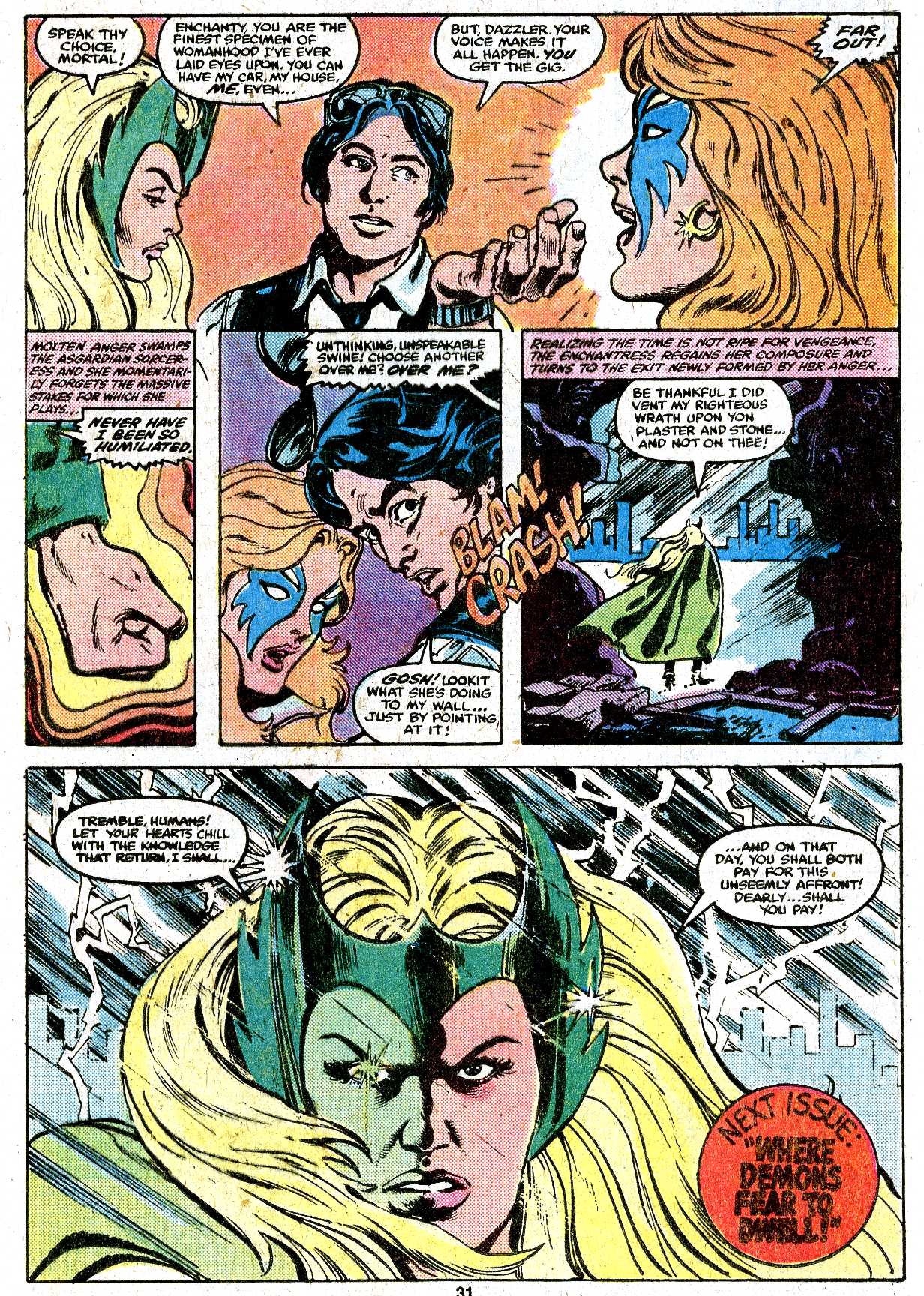 On Earth, Hank (The Beast) McCoy is at his current home of Avengers Mansion, when he reads in the paper of an opening at this same disco and he races to Dazzler’s home (Dazzler, whom he doesn’t know at all) to tell her about it. She goes and auditions for the open singer spot, as does the Enchantress, but Dazzler gets the gig, the Enchantress vows revenge as only Marvel’s Asgardians can.