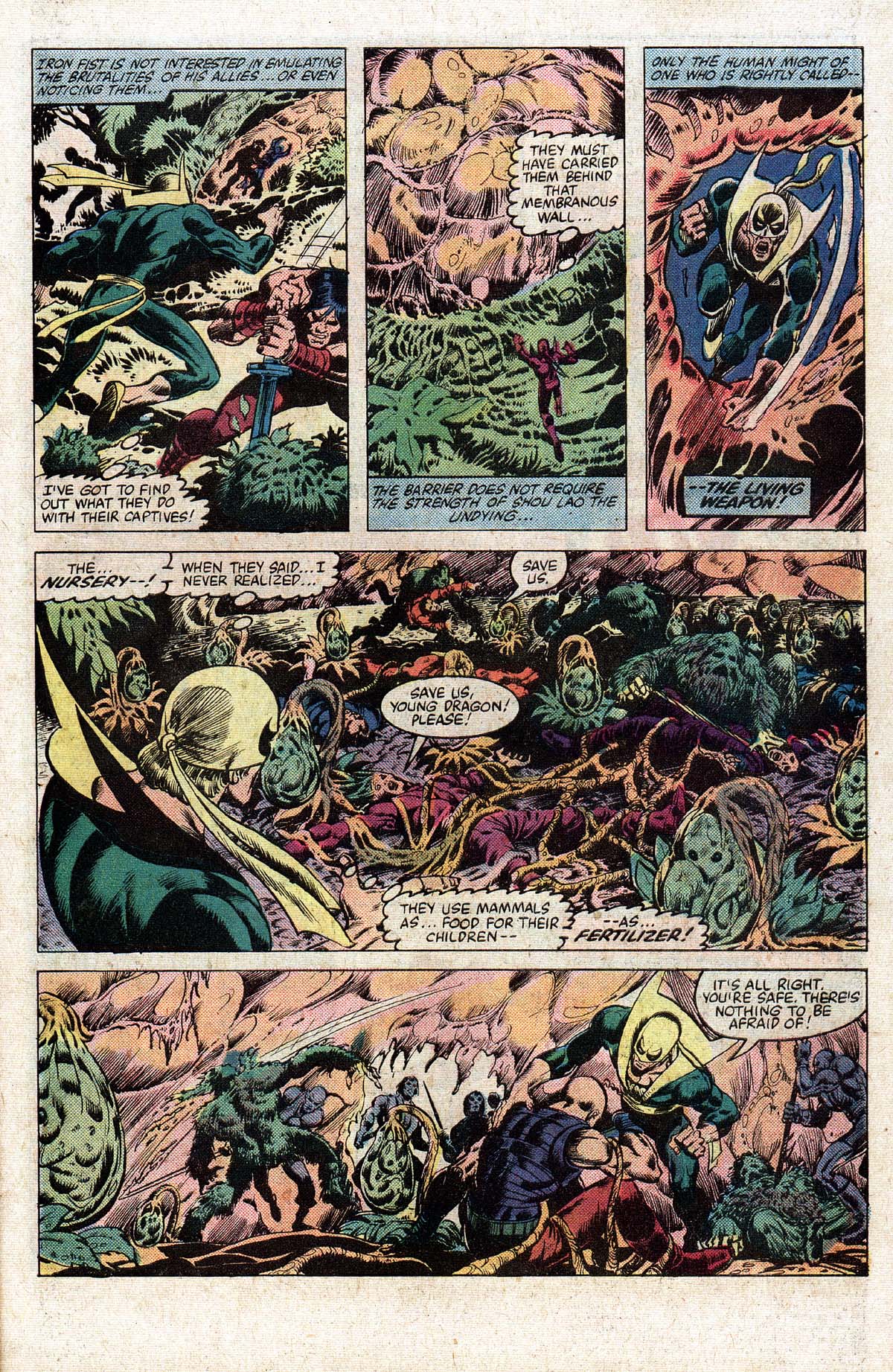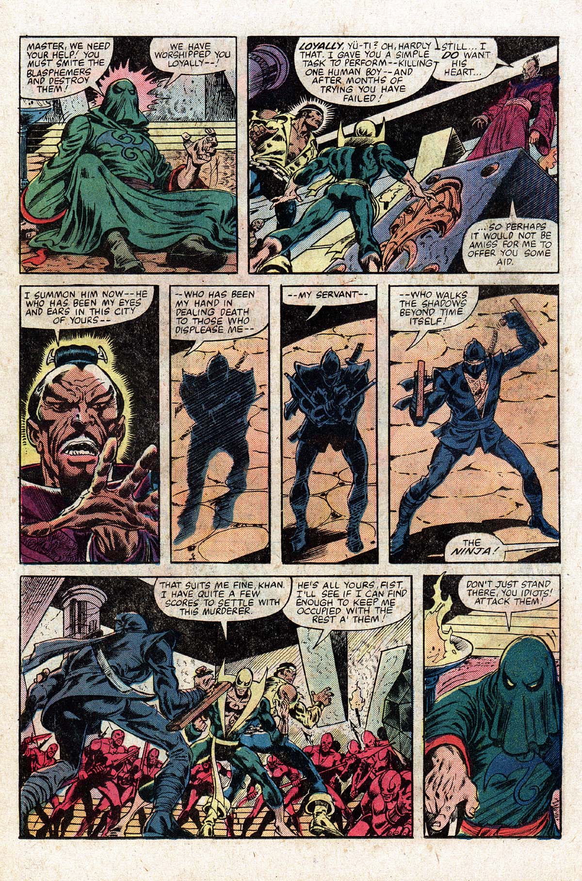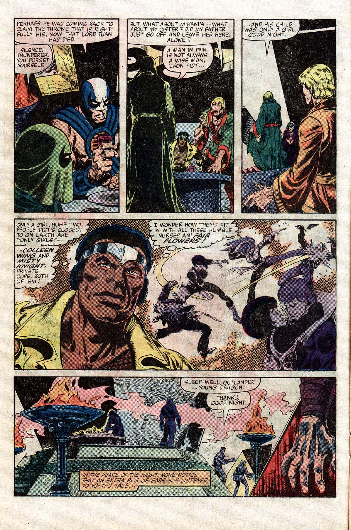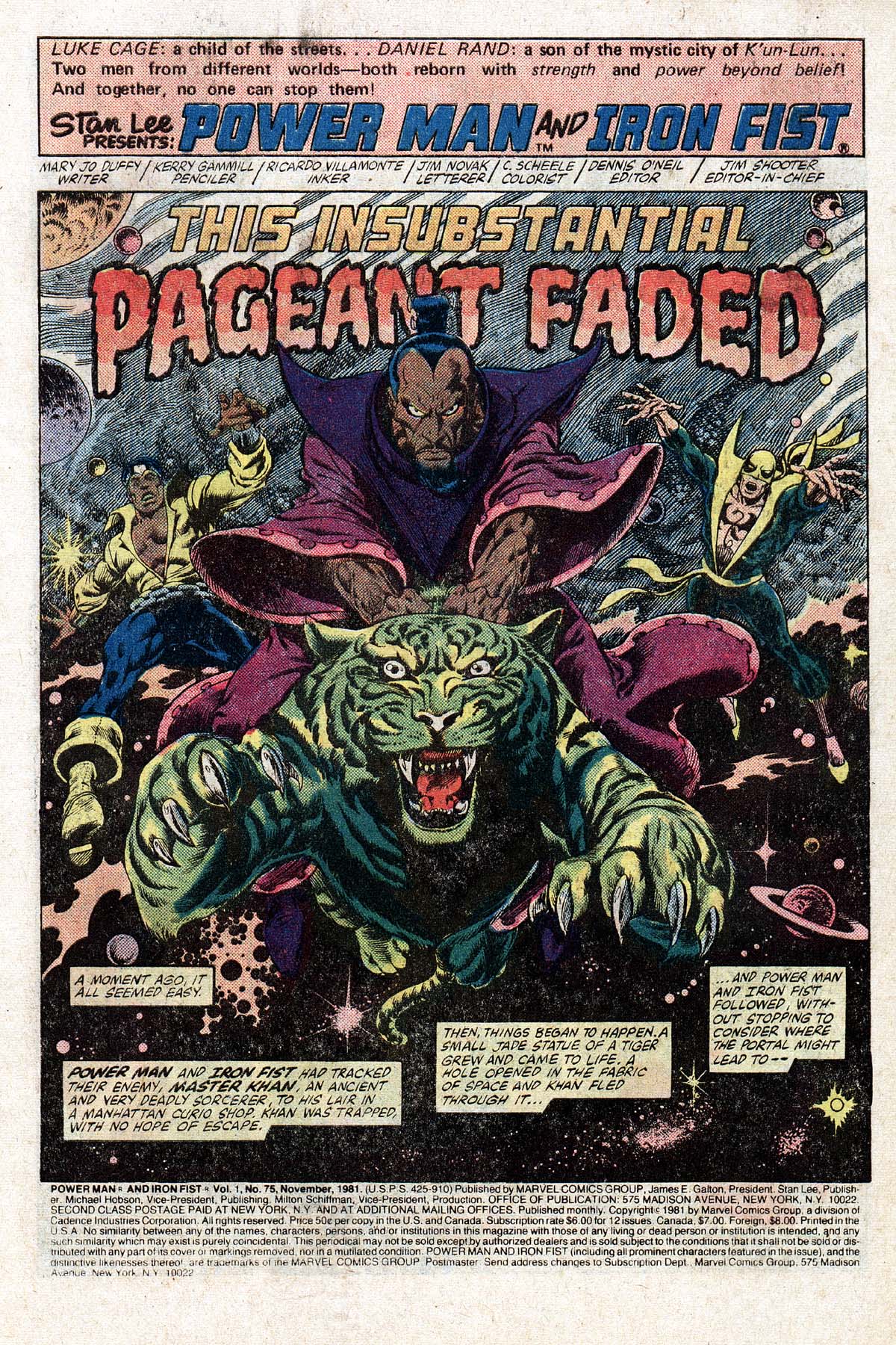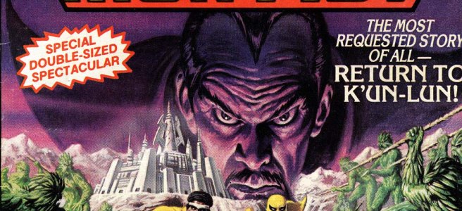 Power Man & Iron Fist 75 was written by Mary Jo Duffy, pencilled by Kerry Gammil and inked by Ricardo Villamonte and opens with Master Khan (Long time Iron Fist villain) riding a jade tiger, being followed by Luke (Power Man) Cage and Daniel (Iron Fist) Rand’Kai through a portal.