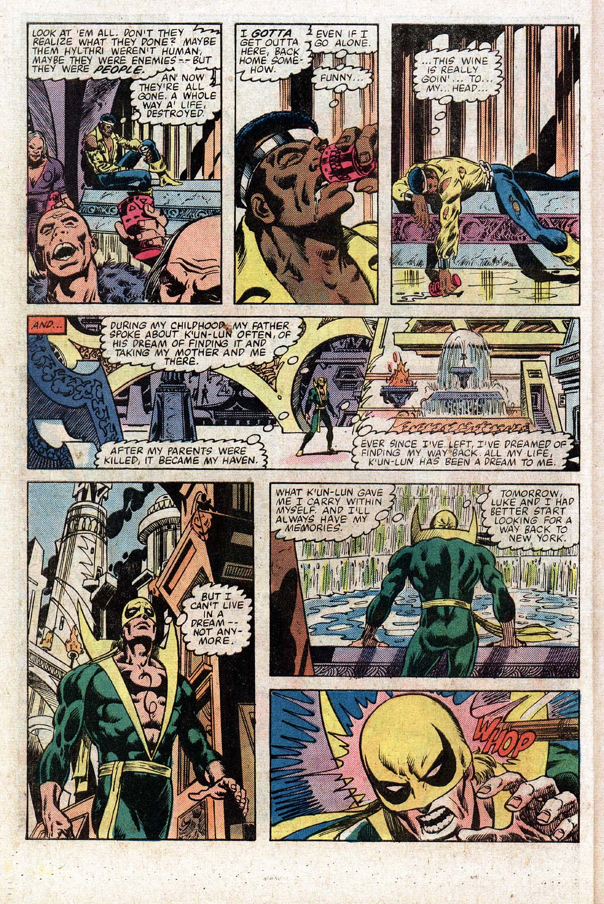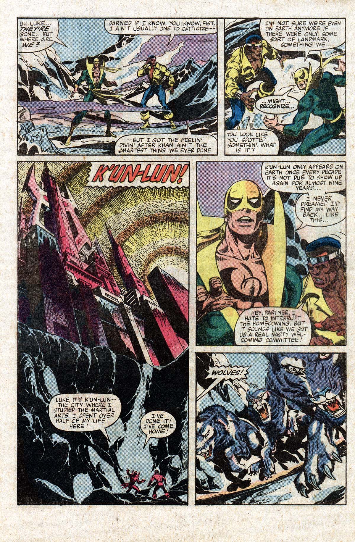They are deposited on a cold mountain top, above them is an ancient city, which Iron Fist recognises as K’Un-Lun, the city where he was raised from boy to man and where he received the power of the Iron Fist.