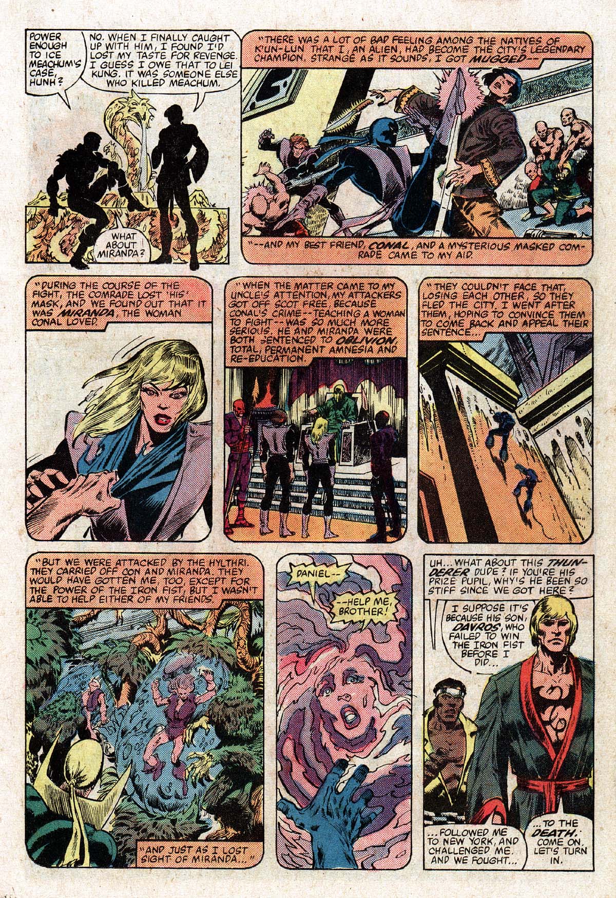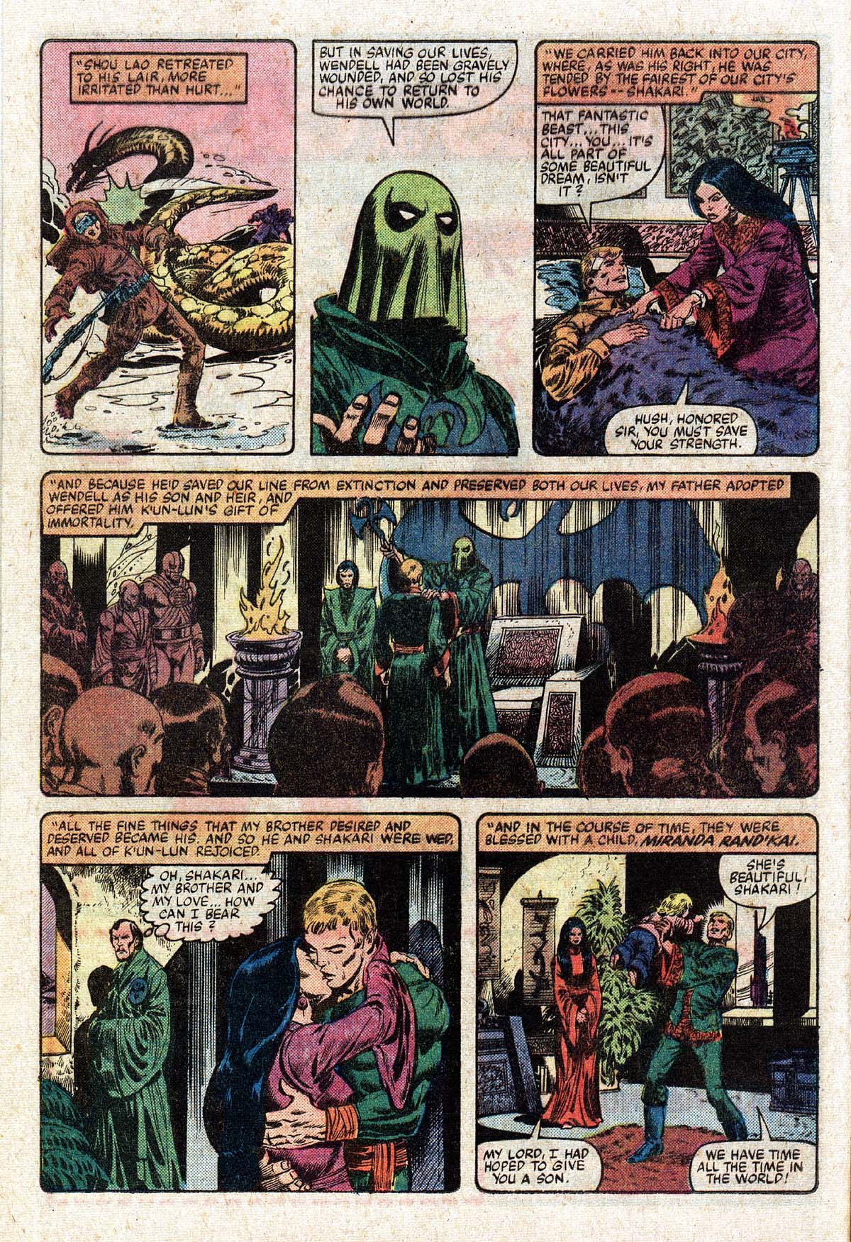 We get some flashback of Yu-Ti and his father , being saved by an american called Wendell Rand. Wendell is injured by the dragon Shou Lao and brought to the city to be healed. Yu-Ti’s father (at the time the Yu-Ti) adopted Wendell, who married a local called Shakari (who his adopted brother also loved) and had a daughter Miranda Rand’Kai. This means Daniel has a half sister. Shakari died shortly after at the hands of the Hylthri and this caused Wendell to leave K’Un-Lun and return to the US. What follows is the origin of Iron Fist again.