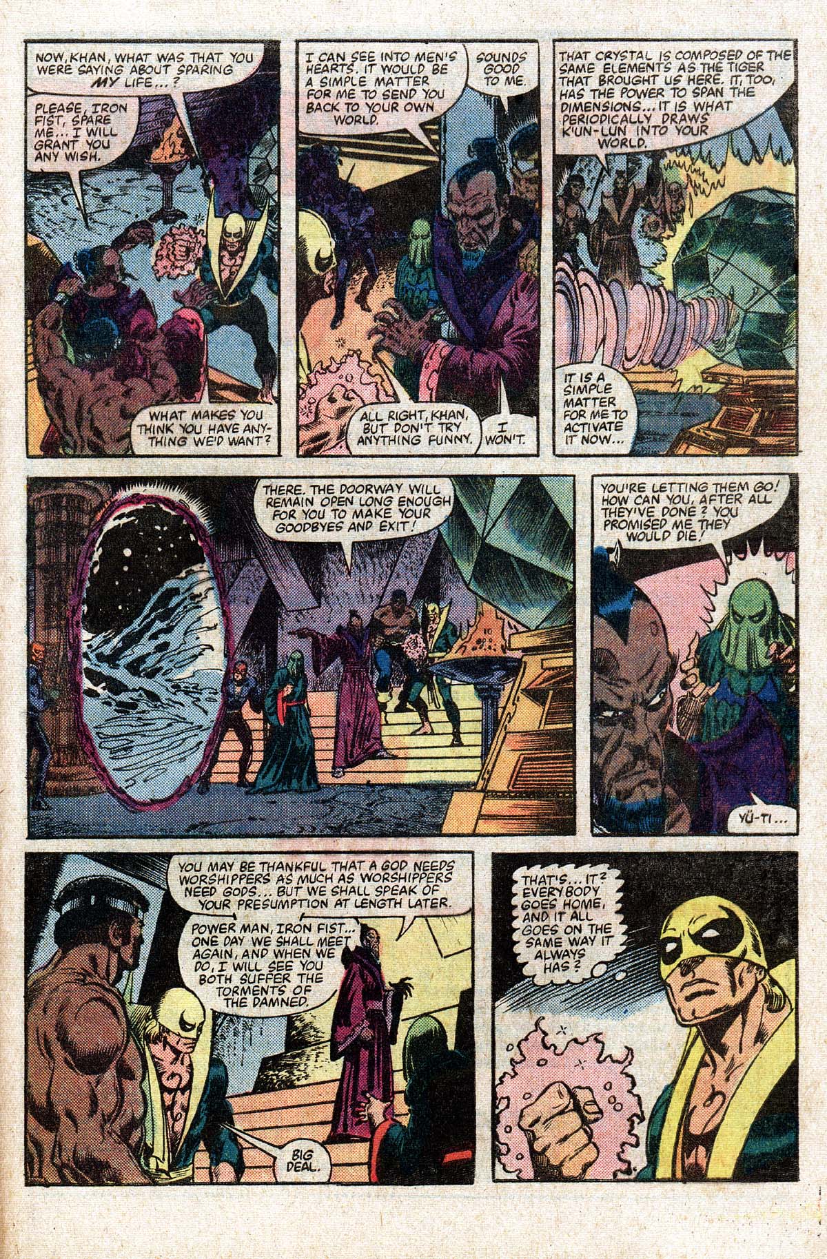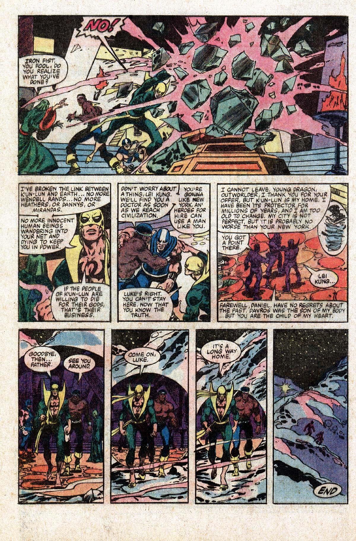 He wakes strapped to a huge emerald, to find that Master Khan is one of the gods of K’Un-Lun and intends to sacrifice warriors to the Hylthri as he has done for centuries, although outside of Yu-Ti, no one knew. Just as Yu-Ti is about to kill Daniel, Luke and Lei Kung burst in to rescue him. There is a pitched battle and Master Khan summons his ninja to battle Daniel, while Luke takes on the entire army of K’Un-Lun. Luke gets to Master Khan and holds him in place, while Daniel threatens to kill him with the power of Shou Lao, which Master Khan both needs and fears and bargains for their return to New York. Rather than simply leave and let this state of affairs continue, Daniel shatters the emerald, cutting K’Un-Lun off from the rest of the world. Danny and Luke walk through the closing portal and start the long walk to civilisation, leaving Lei Kung, the man who raised him as the last honest man in the home he leaves behind forever.