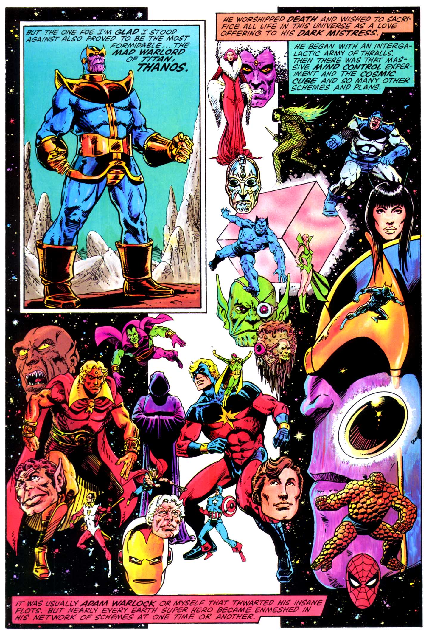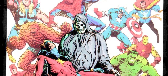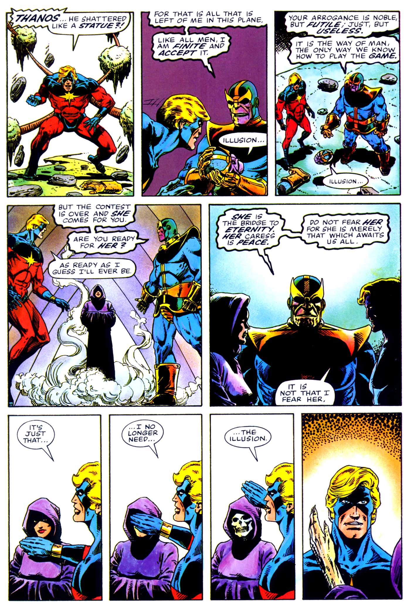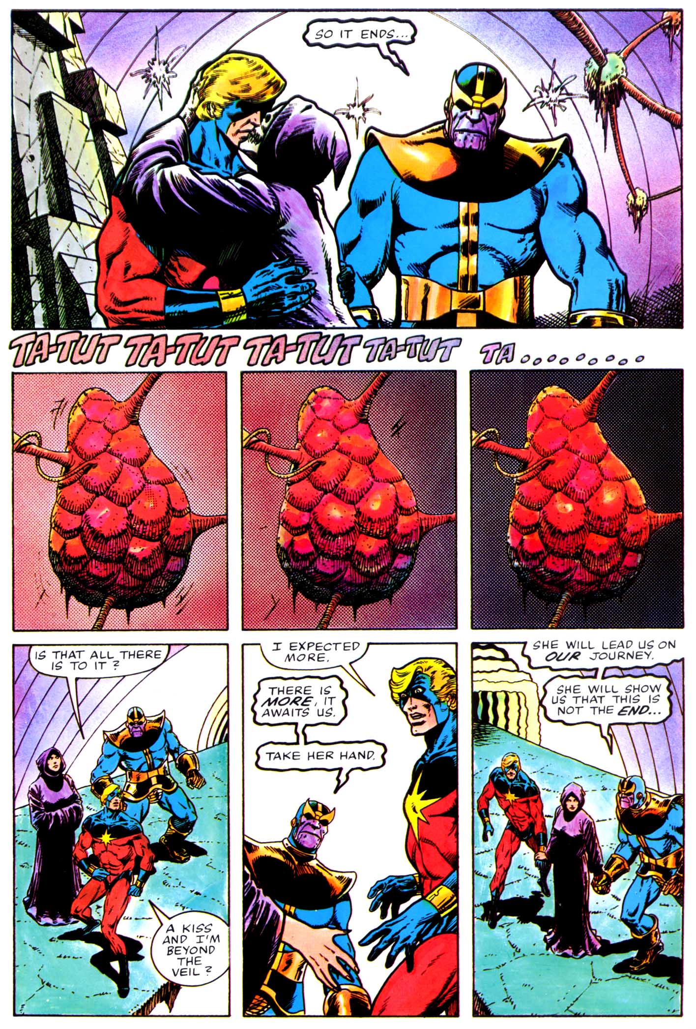 Before the end, Mar Vell is visited by Thanos, who offers him one last glorious battle, which is there to allow Mar Vell to accept his fate. Thanos convinces him to surrender to Death, who after stripping her of the illusion of beauty kisses the skull faced messenger, who takes him to whatever awaits after his life.
