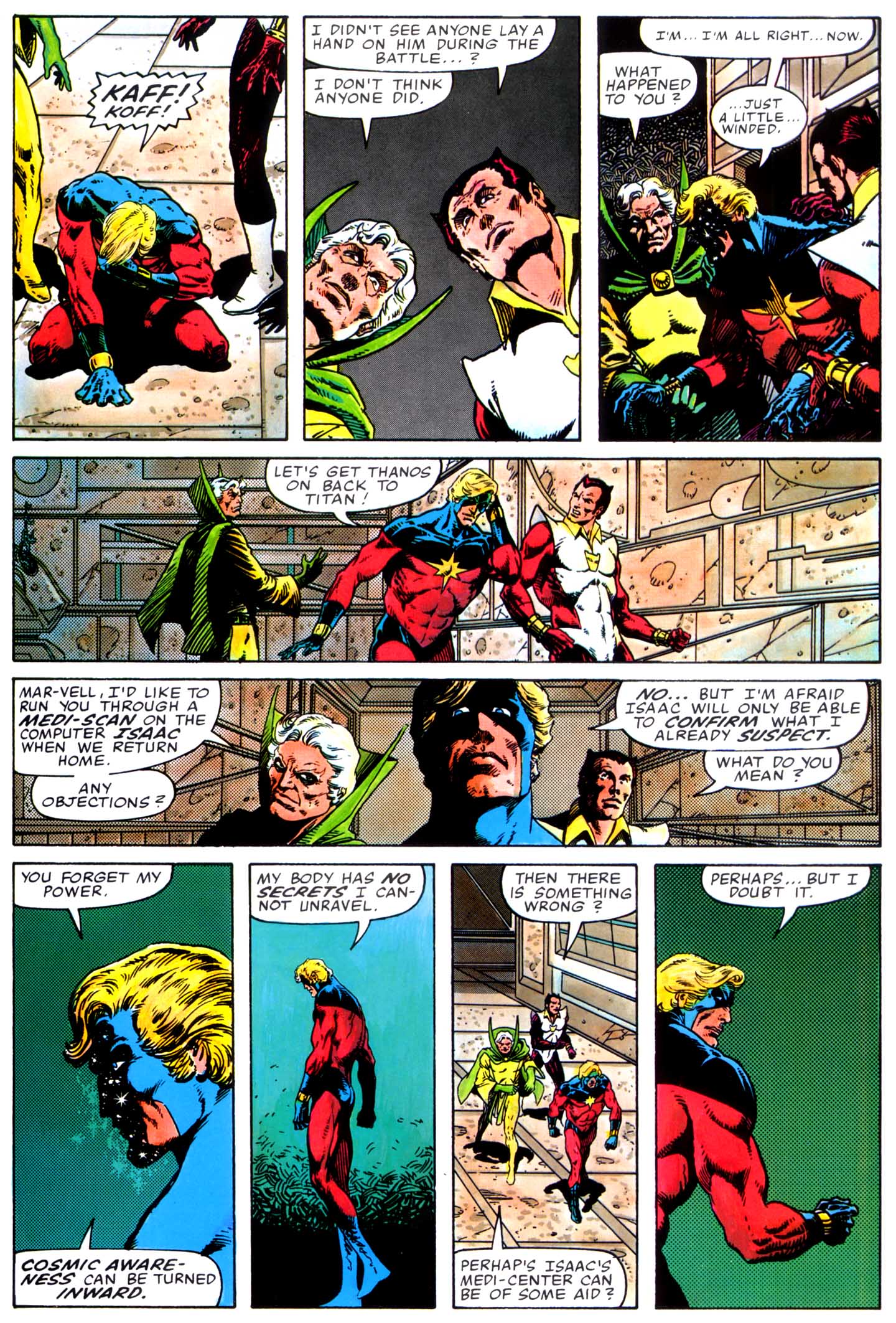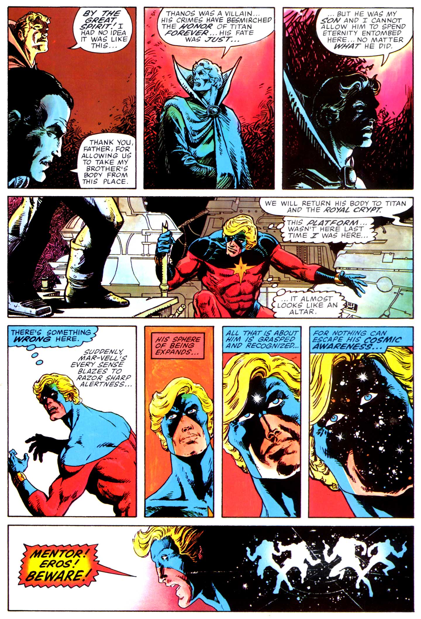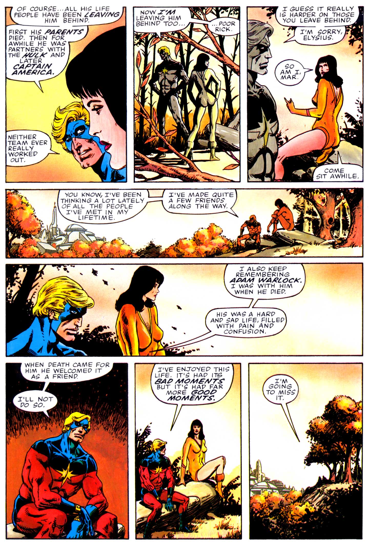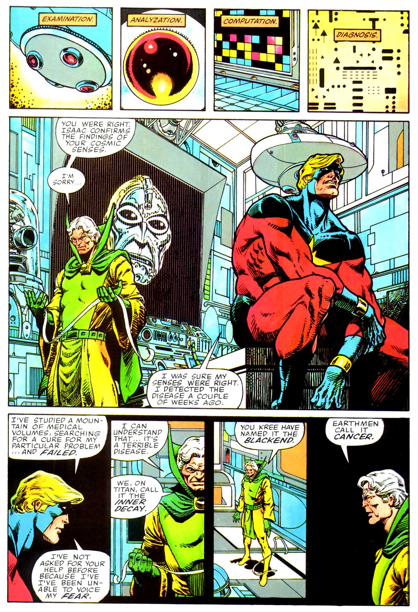 Mar Vell returns to his story, telling of his being bound to Rick Jones and their association with the Avengers, leading to the defeat and death of Thanos. Mar Vell flies to Earth to see Rick, to see if the cancer spread through the symbiosis they had at the time of exposure. He then tells Rick the prognosis, Rick handles it badly. Rick turns to the Avengers, who are unable to help, but that isn’t good enough for Rick. All over the universe, everyone reacts to the news of Mar Vell’s imminent death in their own way. Help is sent, cures are tried, but to no avail. Mar Vell asks that Eros take care of Elysius, when he has passed.