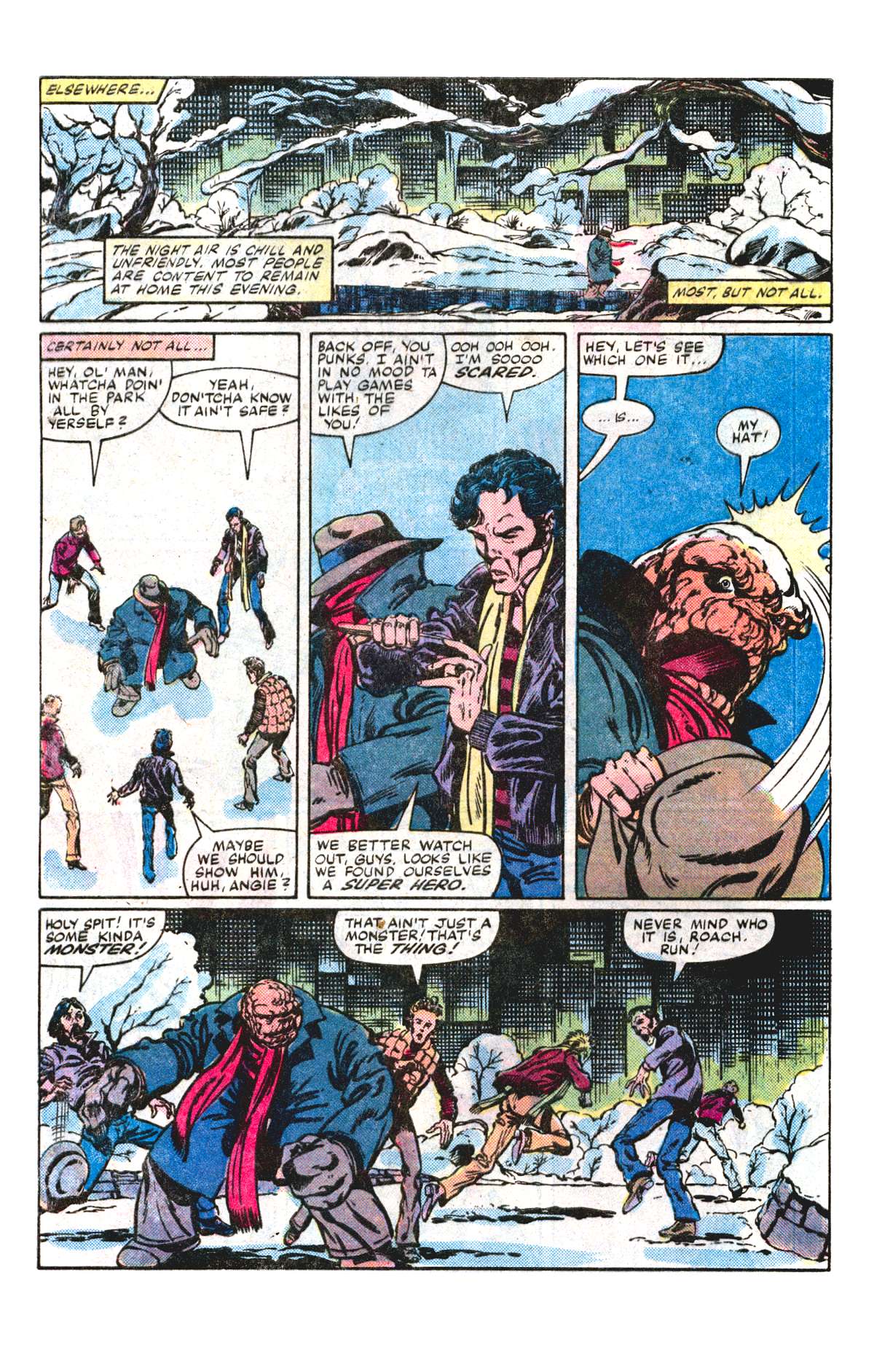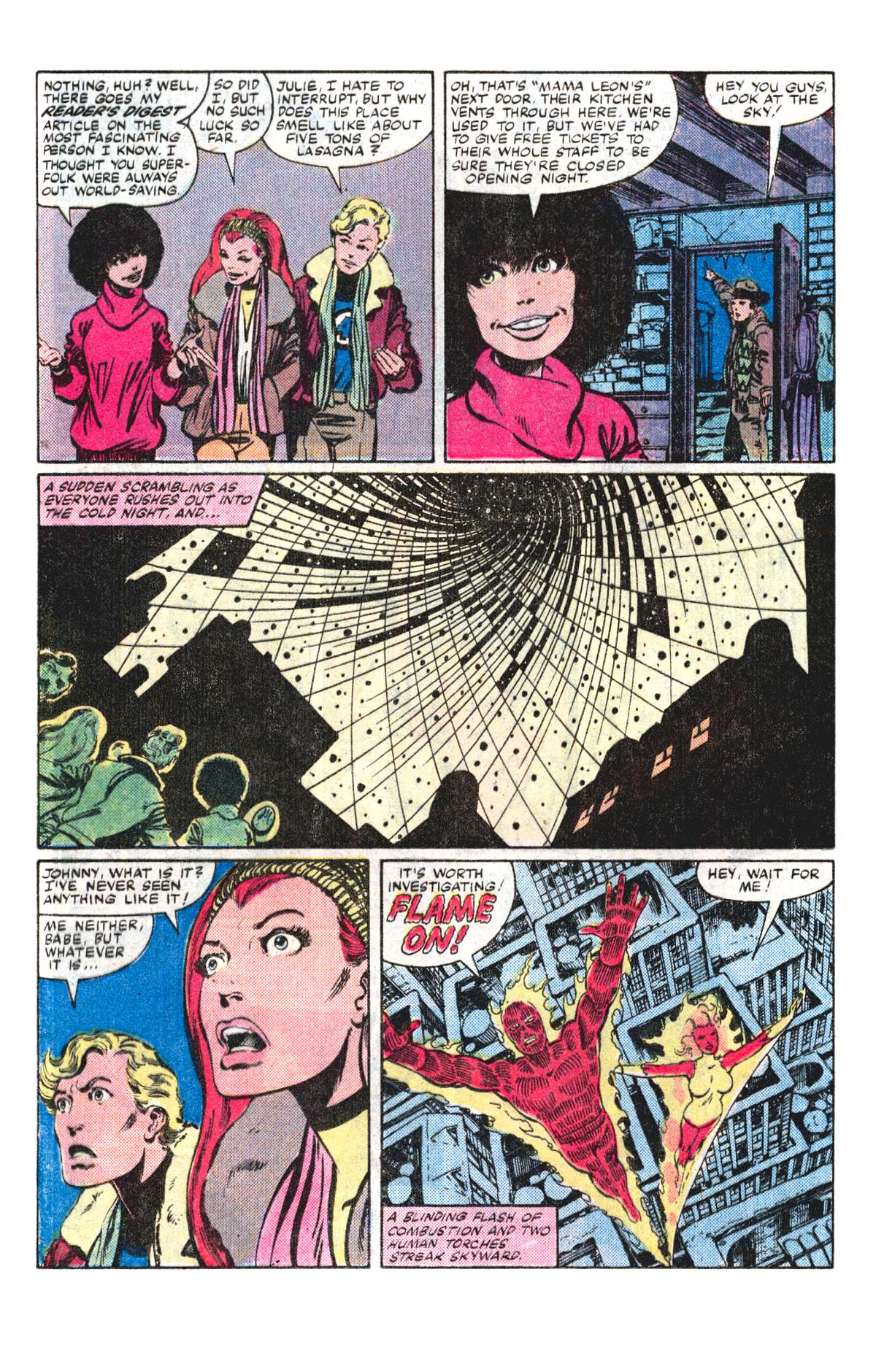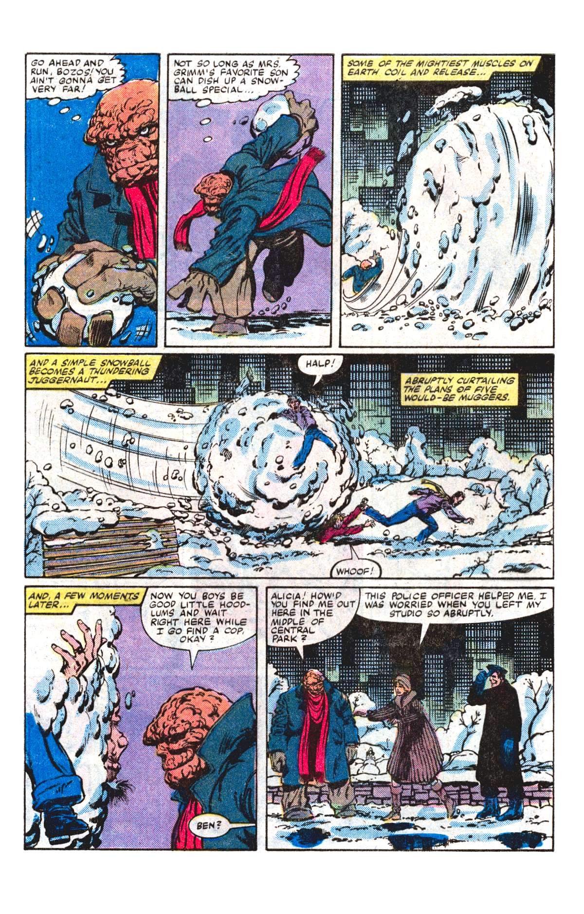 In Central Park, Ben (the Thing) Grimm is having a brooding walk through the park, but is accosted by some muggers. He hands them to a police officer after putting them in a massive snowball and meets up with Alicia, while the police officer thinks that the only reason Ben has Alicia, is that she’s blind. Elsewhere, Johnny (Human Torch) Storm and his girlfriend Frankie (Nova, although I don’t know if she has that name yet) Raye, head to an off broadway theatre and see Frankie’s friend Julie acting but head out into the sky. A little while later, they get to the Baxter Building as Ben arrives, but also arriving is Terrax.
