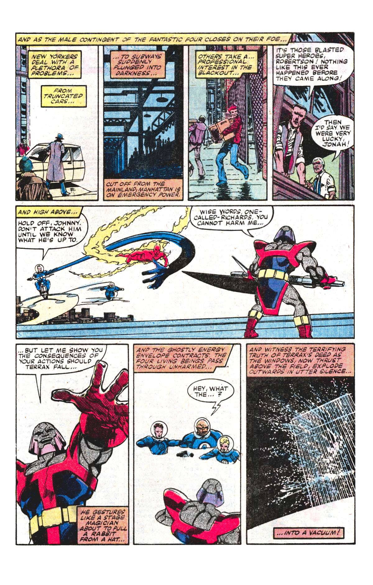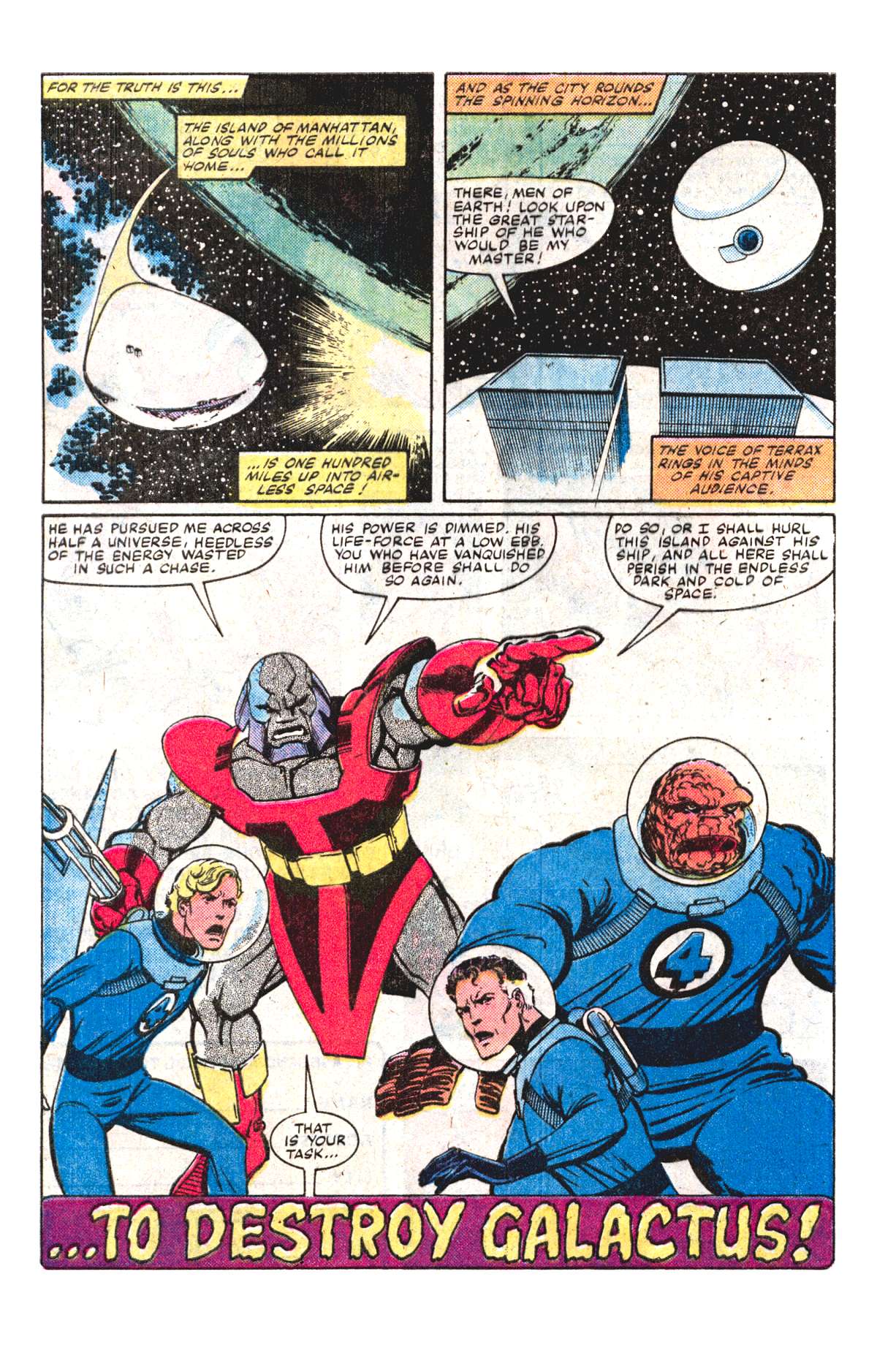 While Thor and Iron Man help those stuck on the bridges and Spider-Man fails to get into Manhattan, the FF go into action. Sue puts an forcefield around the island, keeping the air in and anything else out, whilst Frankie stays with her, Reed, Johnny and Ben get into spacesuits and face Terrax, who puts forth his plan. He will send the island into space, killing all it’s inhabitants, unless the Fantastic Four destroy his pursuing master Galactus.