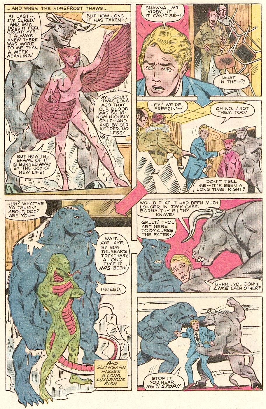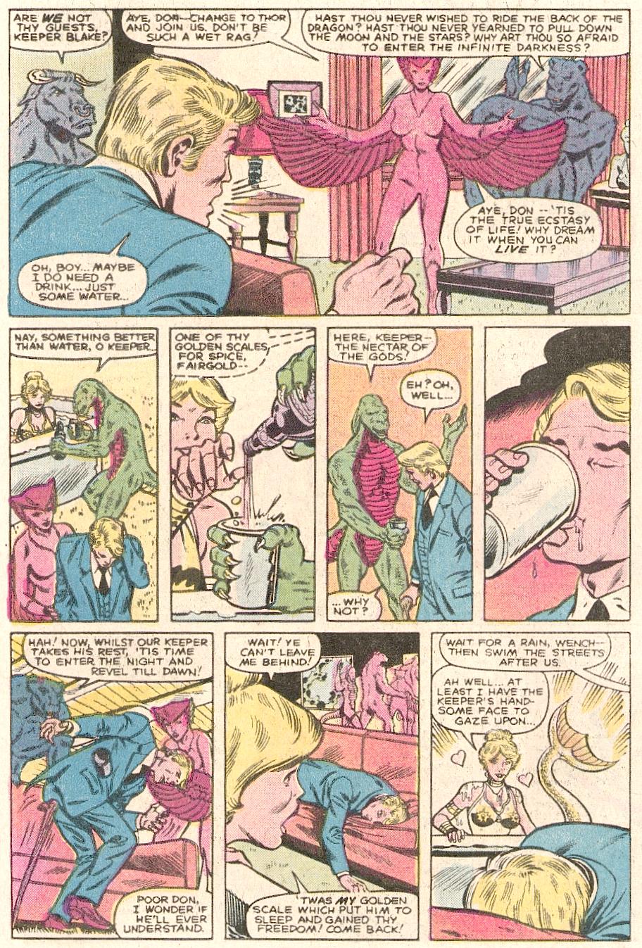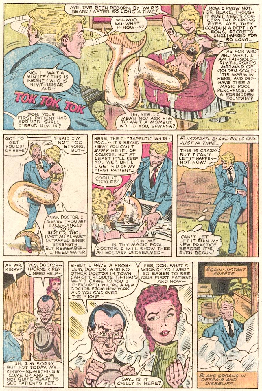 We then go to Chicago, where Dr Don Blake is opening a new doctor’s practice is enjoying a look at a norse exhibit in a local museum. There is a silver chalice there, that flickers with light when no one is looking at it. Blake and his old friend Shawna Lynde go back to his new office and start setting that up. Blake interviews Miss Stevens for a nursing position and as they are talking, she is covered in ice and when it breaks and falls off her, she is now Fairgold, mermaid of golden scales, part of Rimthusar’s menagerie. This mermaid is drying up, so Blake places her in a water therapy whirlpool before his first patient comes in. In walks Thorne Kirby along with Shawna and the same thing happens to them. The diminutive Thorne is transformed into half man half bull Grult, whilst Shawna becomes the winged Kyrie. Two other people from the building come in and are transformed into the bear-like Borna and the reptilian Slithgarn. Immediately Grult and Borna get into a fight and Blake tries to calm them down. He then learns that they retain the memories of their transformed hosts and they escaped the silver chalice of Rimthusar, an ancient god of Asgard. After revealing himself as Thor and then having a drink with the menagerie, Blake is drugged and the four walking members of the menagrie go out to have some fun.