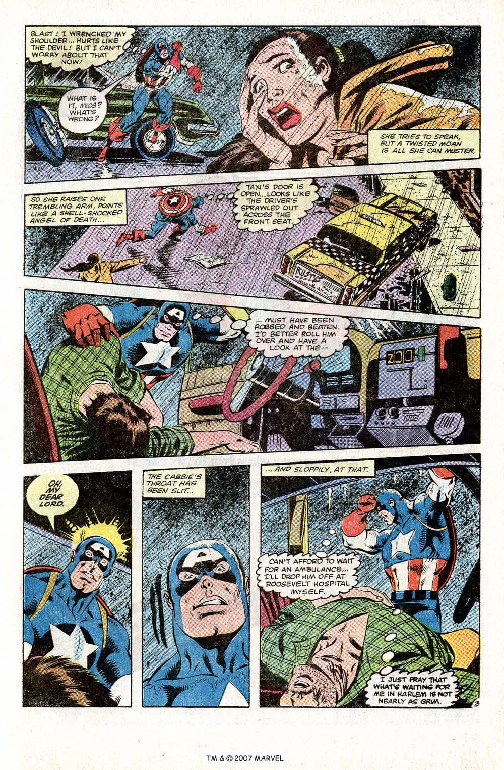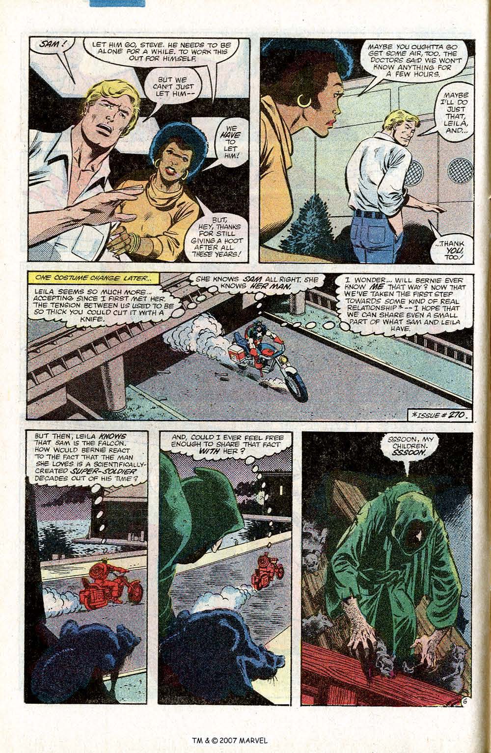Captain America 272 was written by J M DeMatteis and drawn by Mike Zeck and opens with Steve (Captain America) Rogers riding his bike in costume through one of the seedier neighbourhoods in  New York. He comes across a car accident and see’s that the driver (a cabbie) has had his throat slit. Steve drops him off at the hospital nearest too him, before heading to another hospital in Harlem. There he finds Sam (the Falcon) Wilson and several of his family (including his girlfriend Leila) who are there because Sam’s nephew Jim has been shot foiling a liquor store robbery. Steve arrives (out of costume) to comfort Sam, who punches a wall in frustration. Steve tries to help, but it ends in speeches as Steve’s help always did in bronze age cap appearances and Sam storms out. Leila tells Steve he should probably go too, leaving Steve (Back in the costume) riding off thinking how much better they seem to get on. Not what I think when someone asks me to leave, but that’s just me.)