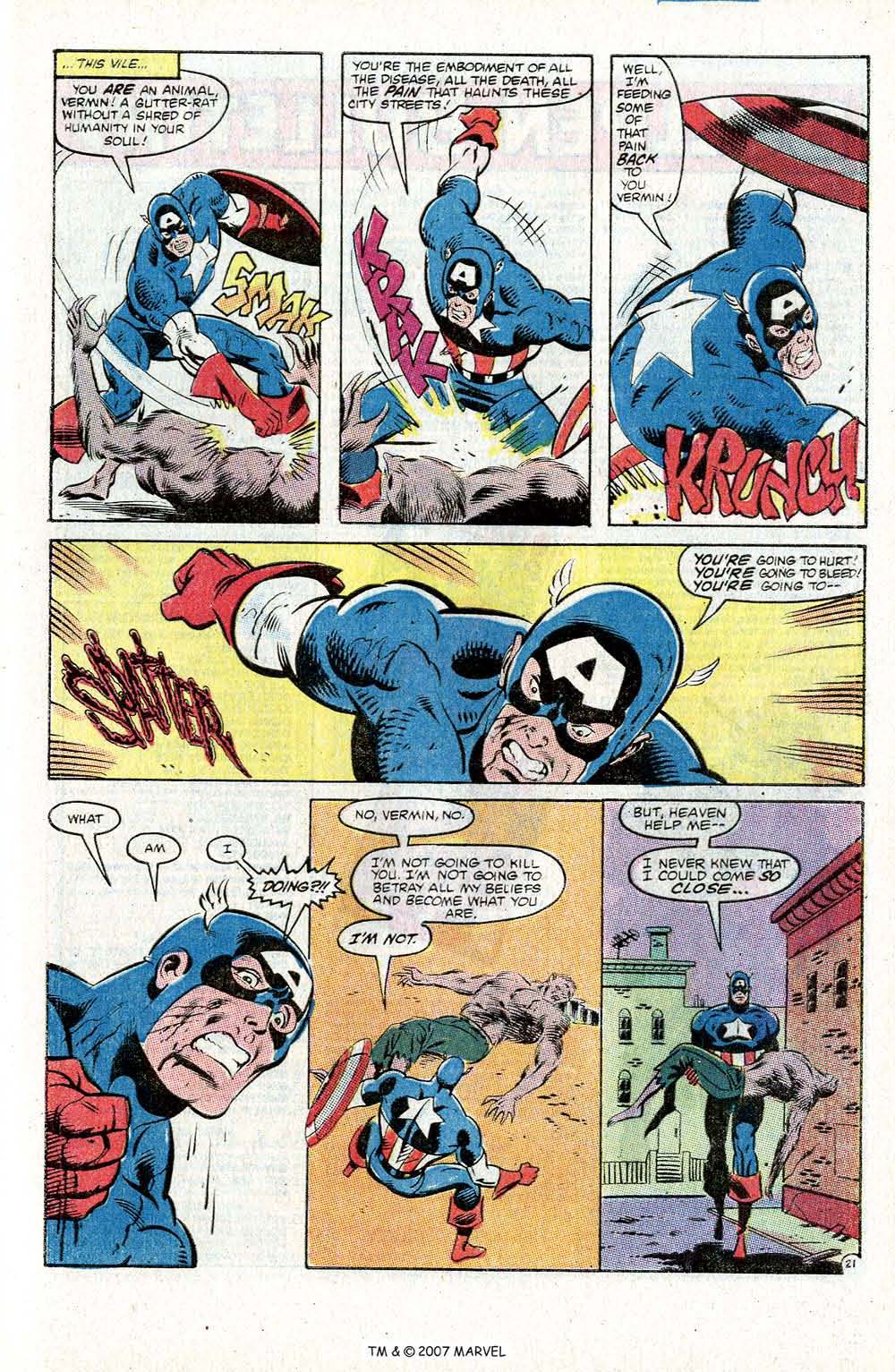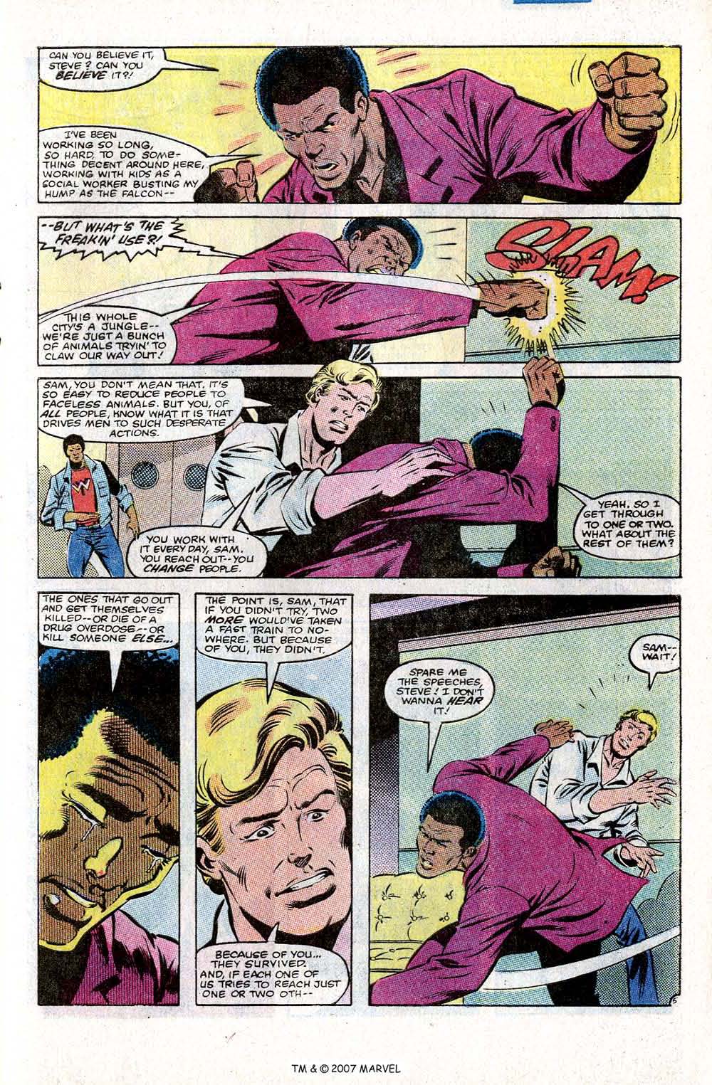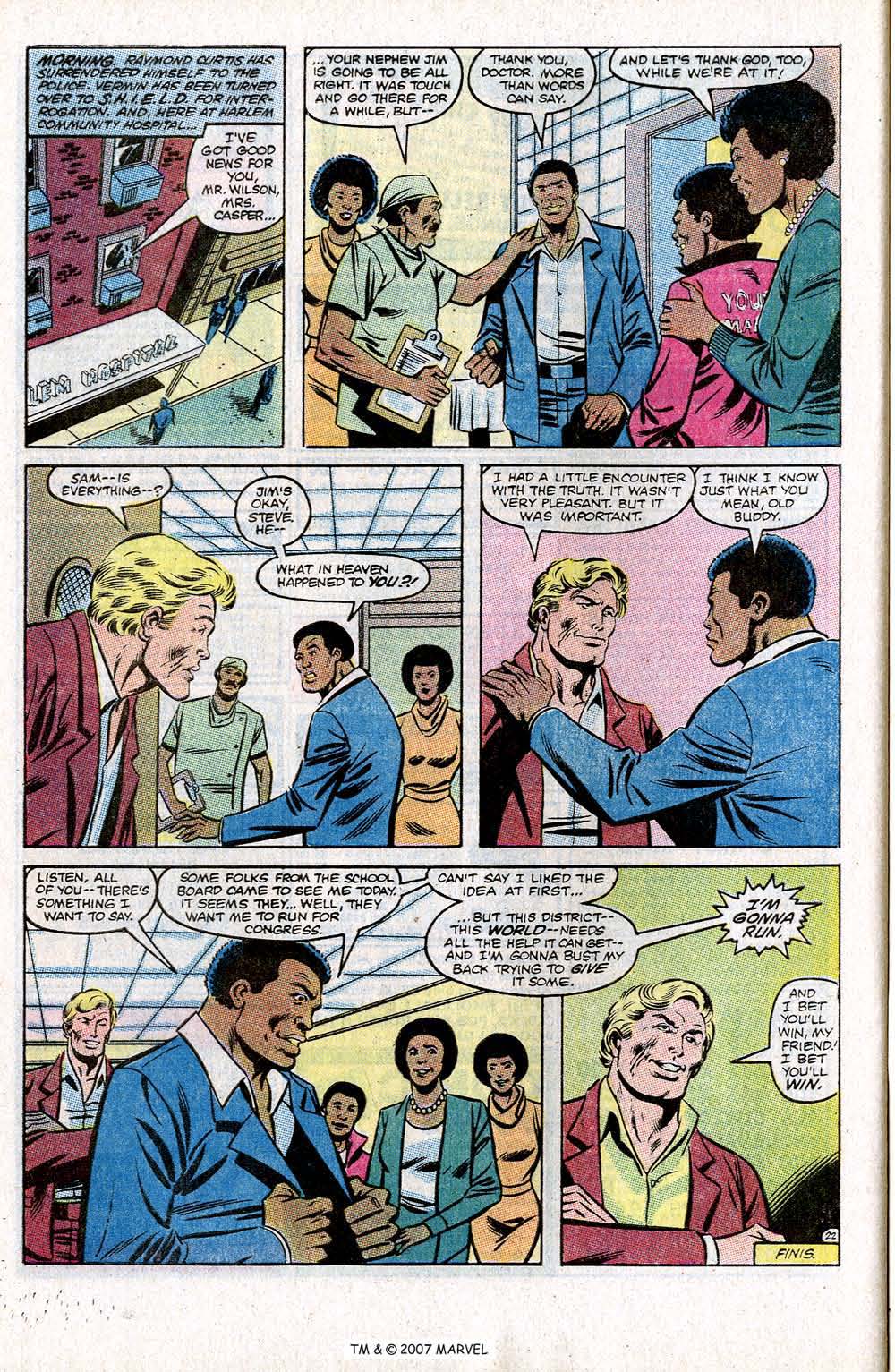 Meanwhile the fight between Cap and Vermin is more and more vicious as Cap learns that Vermin was aimed at him by as yet unnamed masters. The fight ends with Cap getting the upper hand and beating Vermin into the floor, almost to the extent of killing him, but he stops himself short, only beating Vermin to a pulp. Shaken by the extent of his rage, he drops him off with the authorities and goes back to Harlem to learn that Falcon is going to run for congress.