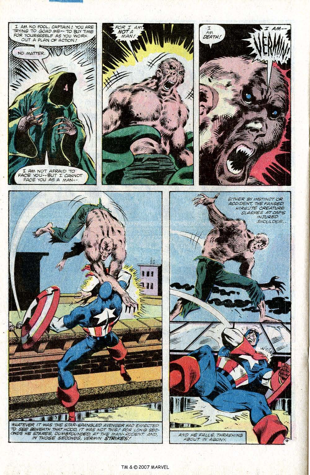Cap is then attacked by a figured clad in green robes, who slashes at Cap with razor sharp nails and leads him something of a chase, until he is cornered on a roof and the robed figure reveals himself as the rat like supervillain Vermin. A vicious fight between Cap and Vermin (along with his army of rats, yes that right, rats) meanwhile Falcon finds Little Angel and takes him home to his mother, who informs him that Little Angel is really Raymond. After a nice talk with Raymond’s mother, Falcon talks to who Raymond, who confesses that he shot someone while high on weed and smack, that person was Jim Wilson. Falcon is about to lay into the kid, but realises what he is doing and comforts him and his distraught mother.