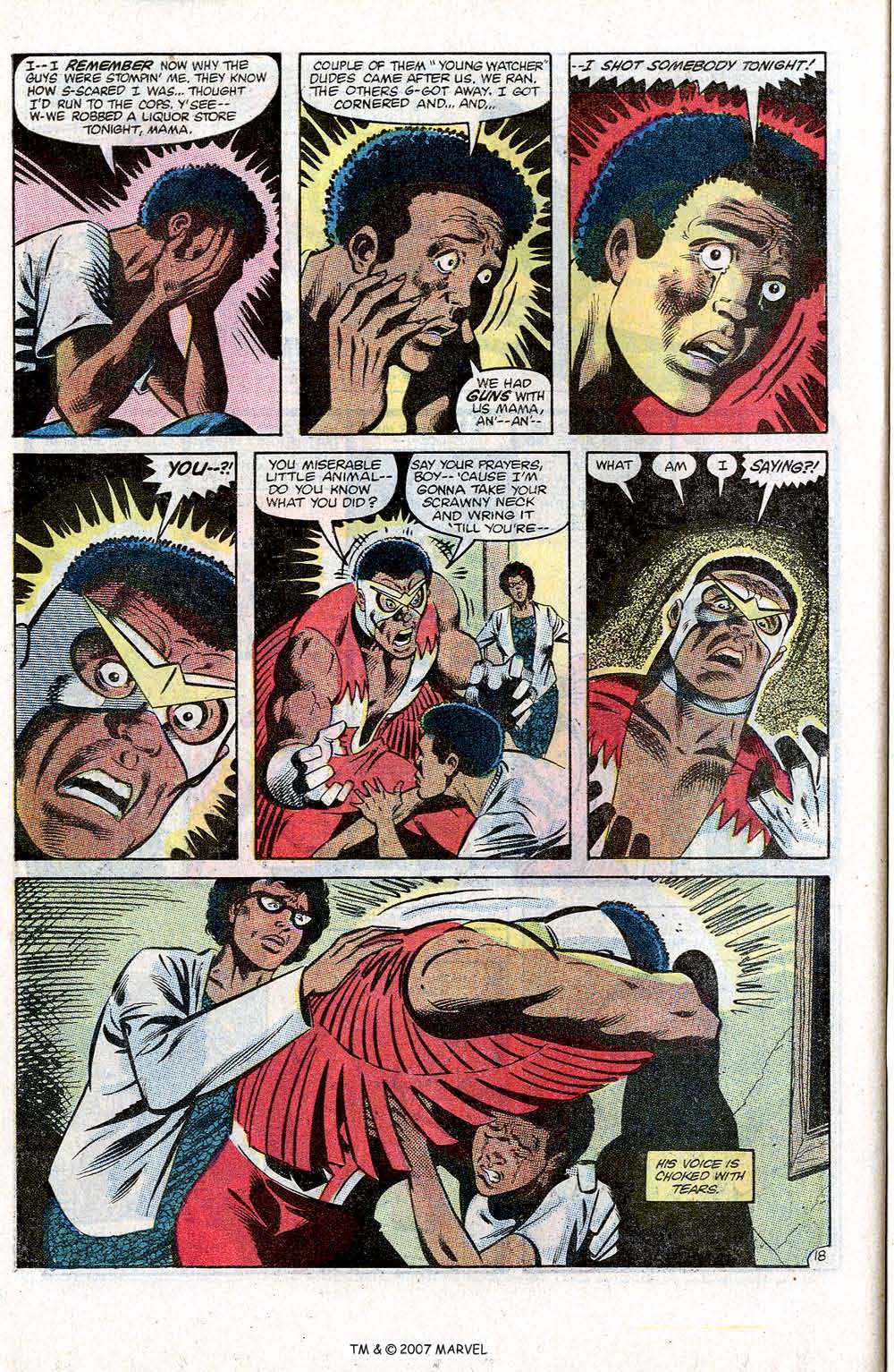 Sam gets into his Falcon gear and flies around to clear his head, seeing a young boy, who has clearly been beaten up, on a rooftop. Falcon lands and is trying to help the young guy get home, when a gang of armed men try to stop them. There’s a tense staredown and they punks open fire, but hit nothing but brick, while Falcon (and his pet falcon Redwing) take the group apart, but the youngster (Little Angel) has already ran off.