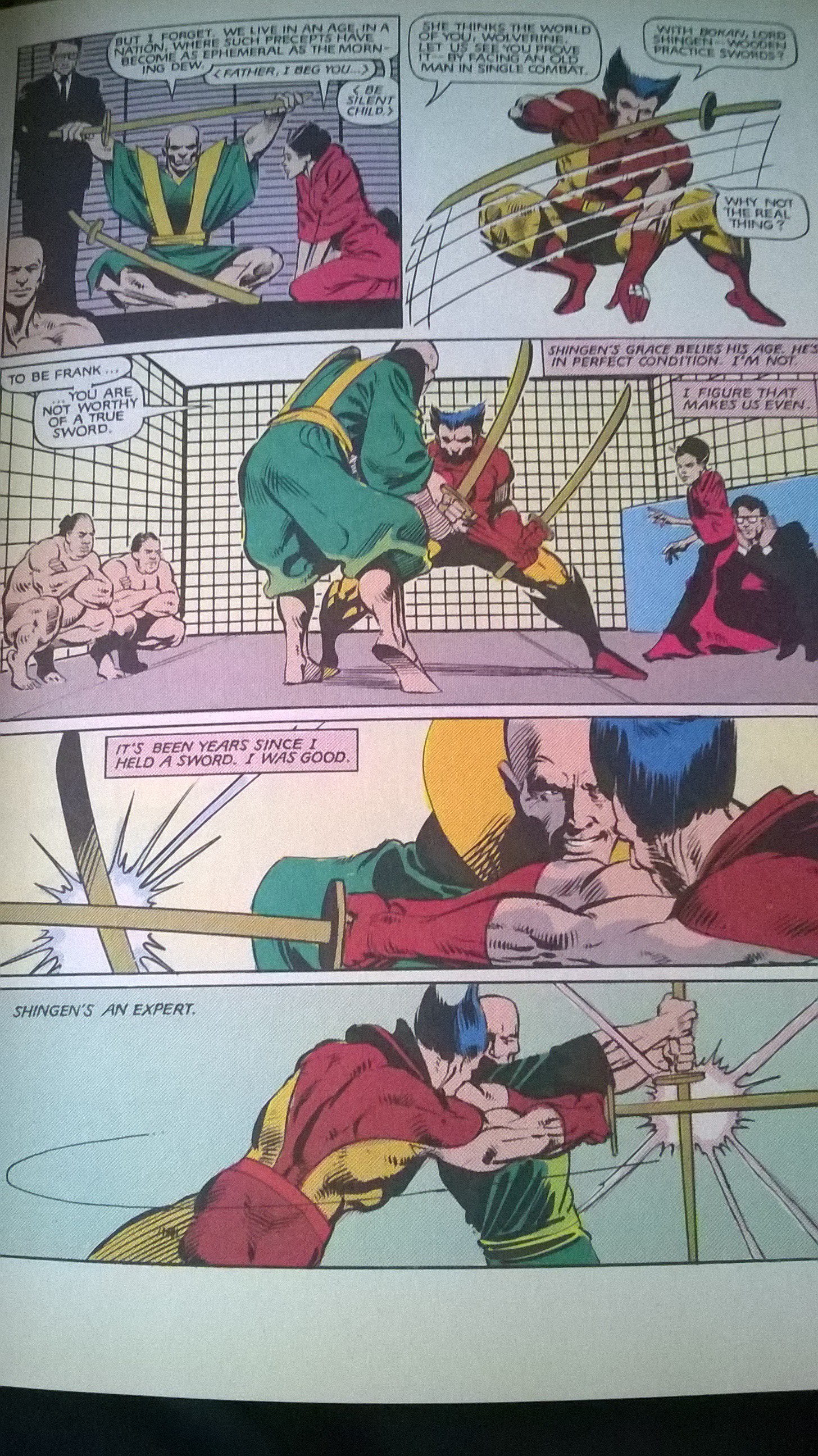 Just outside, he is attacked by throwing stars, laced with poison, he awakes to face Mariko’s father, Lord Shingen. Shingen goads Wolverine into a fight with wooden swords and being far more skilled strikes Wolverine to cause the maximum amount of pain, along with some cheating, it causes Wolverine to unsheathe his claws and dishonour himself before the woman he loves, just as Shingen planned, then the poisoned Wolverine is beaten by Shingen, knocked out, redressed and dumped in the alley.