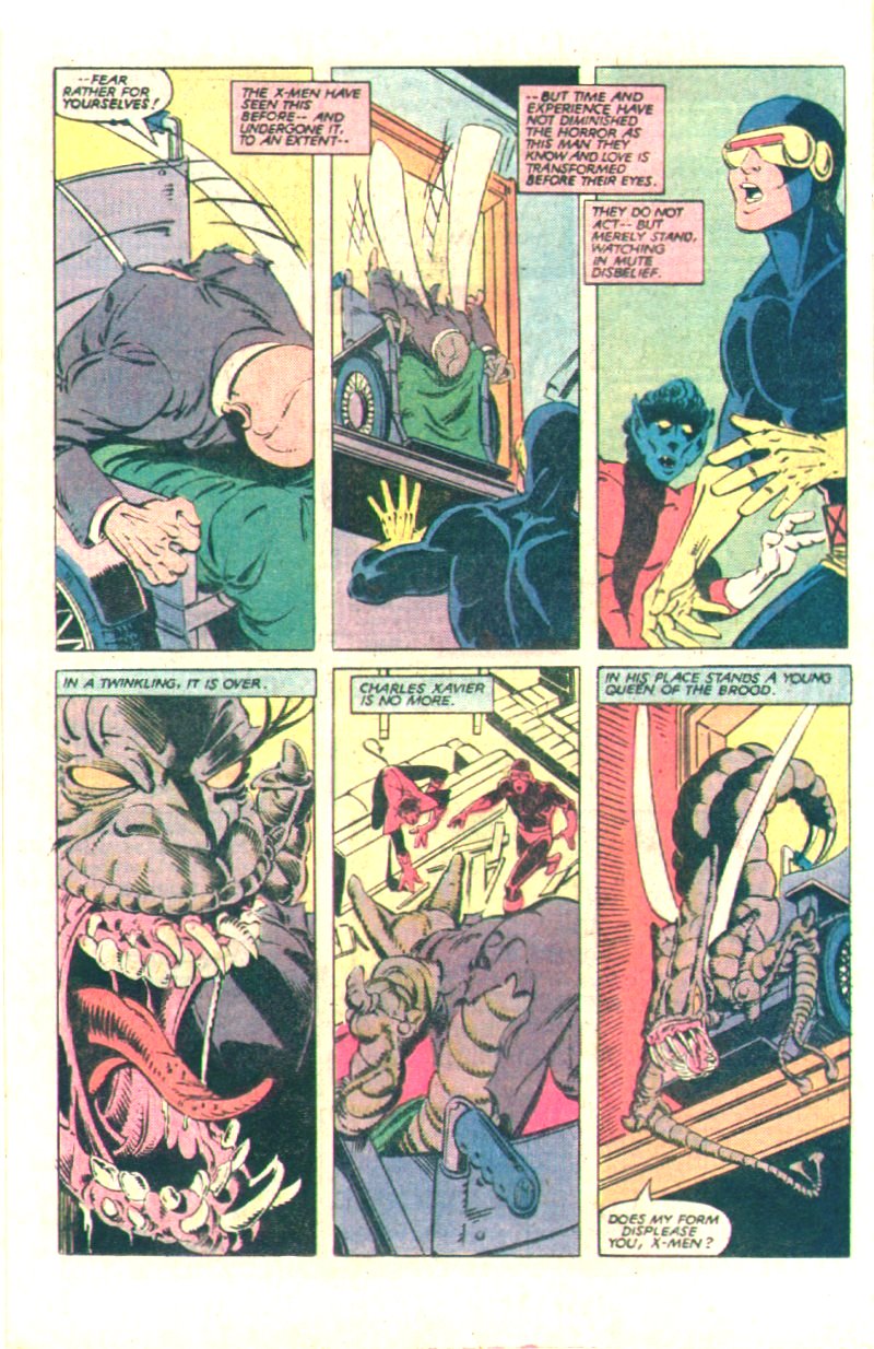 There is a brief battle, with the new students doing well, but clearly outclassed by the battle tested X-Men. They are too late to stop the Brood hatching and the Professor transforms into a Brood queen and attacks both teams. Working together the X-Men defeat the queen, with Storm delivering the coup de grace. From within the Brood’s mind, the Professor begs to be killed, but Cyclops refuses. He talks about hope and creation over fear and death and immediately earns the respect of the New Mutants. The group adjourn to the Starjammer, spaceship and home to the Star-Jammers and using their advanced technology a new body is cloned for Professor X for his brain to be placed in, with all of the Brood DNA removed. Also on board is Professor X’s lover Lilandra Nerimani, recently deposed Empress of the Shi’Ar Empire, who is met by Gladiator, of the Shi’Ar Imperial Guard. Gladiator informs her that Reed (Mr Fantastic) Richards of the Fantastic Four has saved the life of the world devouring Galactus. Lilandra contacts the FF and informs them that they will be held responsible for any harm that Galactus causes in the future.