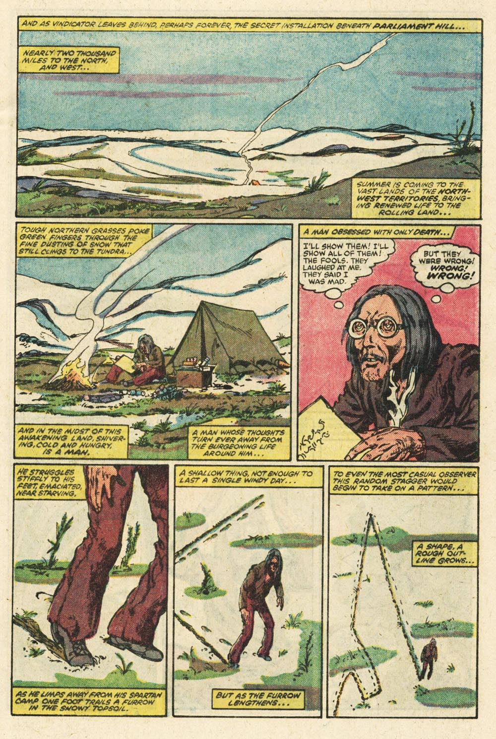 Synopsis: Alpha Flight 1 was written, drawn & inked by John Byrne and opens with the ending of Alpha Flight. Once government sponsored and funded, now kept on as RCMP auxillaries. As their headquarters is shut for the last time, the now unemployed James MacDonald ‘Vindicator’ Hudson is despondent as he flies home in his costume/battlesuit. As this is going on, an old man carves a pattern in soil somewhere in the northern tundra and begins to use some forgotten magic on this person-ish shaped mark on the ground… it begins.