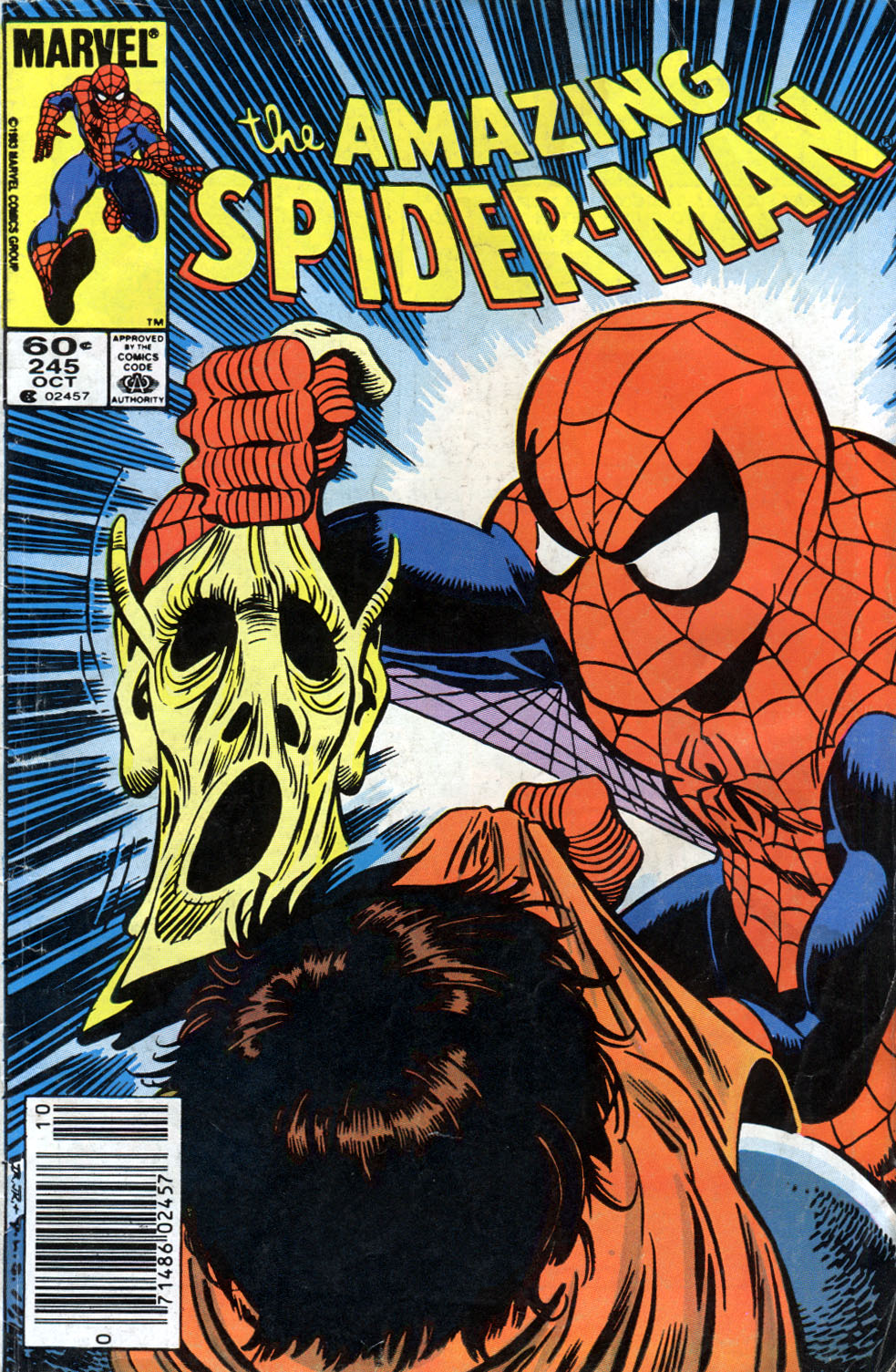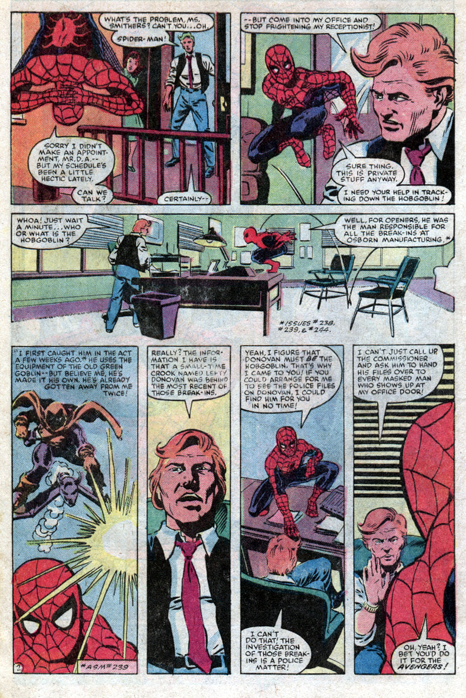 Synopsis: Amazing Spider-Man 245 was written by Roger Stern with art by John Romita Jnr and Dave Simons and opens with Spider-Man trying to get some information from New York’s DA Blake Tower, specifically information regarding Lefty Donavan, suspected by Spider-Man of being the Hobgoblin, a new Green Goblin inspired villain. Tower, as you can imagine, tells him no and Spider-Man leaves, realising that he can’t deal with the DA without connecting the dots between the Osborn family and the Green Goblin.