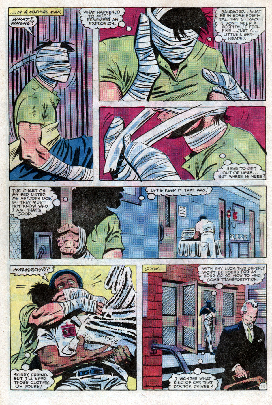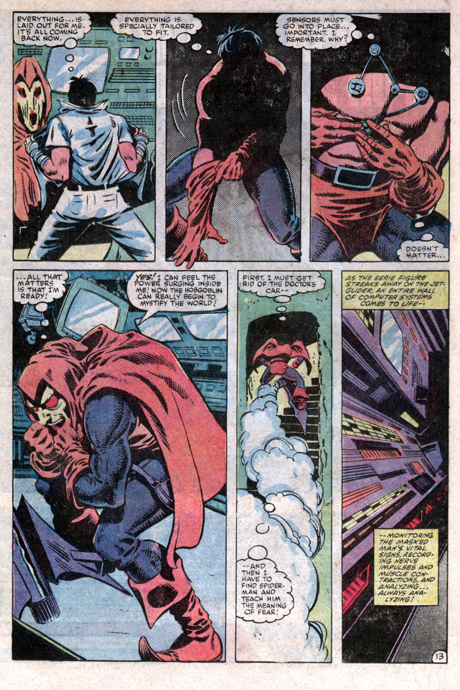 Weeks pass and the unseen man wakes in hospital and slowly makes his way out, then after stealing clothes from an orderly he kills and a car from a doctor, he drives back to Long Island, goes under the house and dresses in the Hobgoblin costume, taking care to add sensors to his chest. As the Hobgoblin he vows to teach Spider-Man, the meaning of fear. Meanwhile Spider-Man has been looking for the Hobgoblin for those weeks and talks to a Detective Lou Snider, who lets him look at the files he asked about, but in a very ‘I didn’t show you this’ sort of way. Spider-Man learns that Lefty Donovan was arrested at the time that he last battled the Hobgoblin, so it can’t be Lefty. Snider comes back in and tells him of the Hobgoblin being all rampagey in mid-town.
