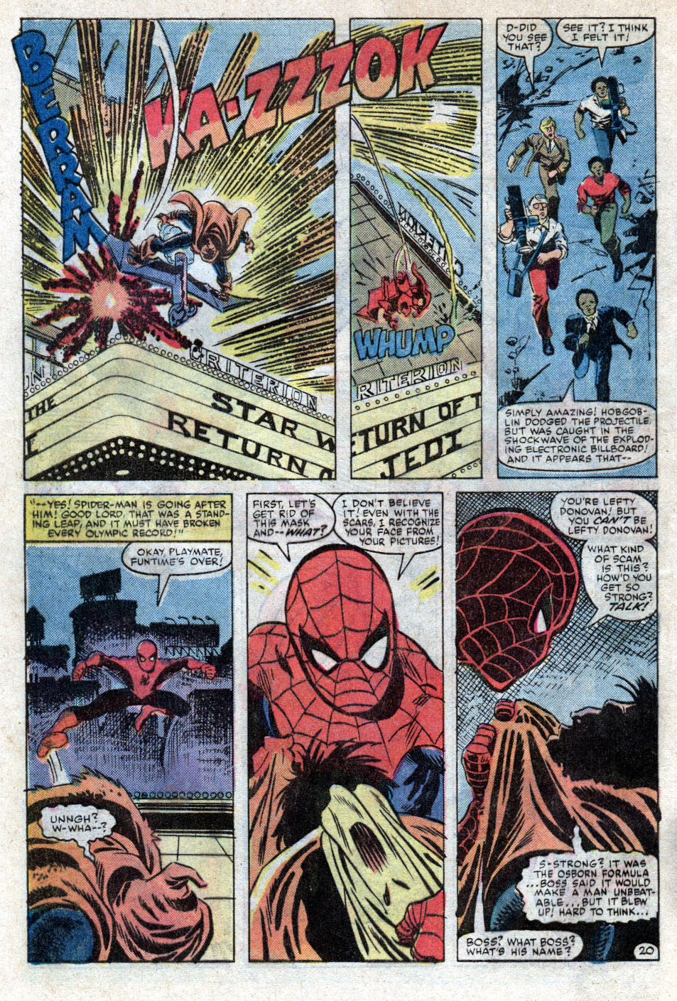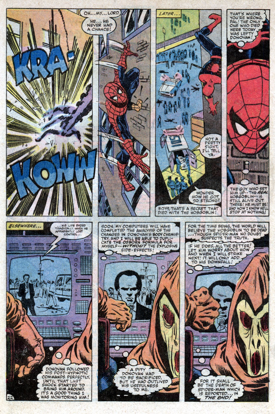 Spider-Man arrives and battles with the Hobgoblin, it’s a fierce one, with the Hobgoblin’s new strength making it a hard fight, but Spider-Man takes him down and finds under the mask is…. Lefty Donovan.