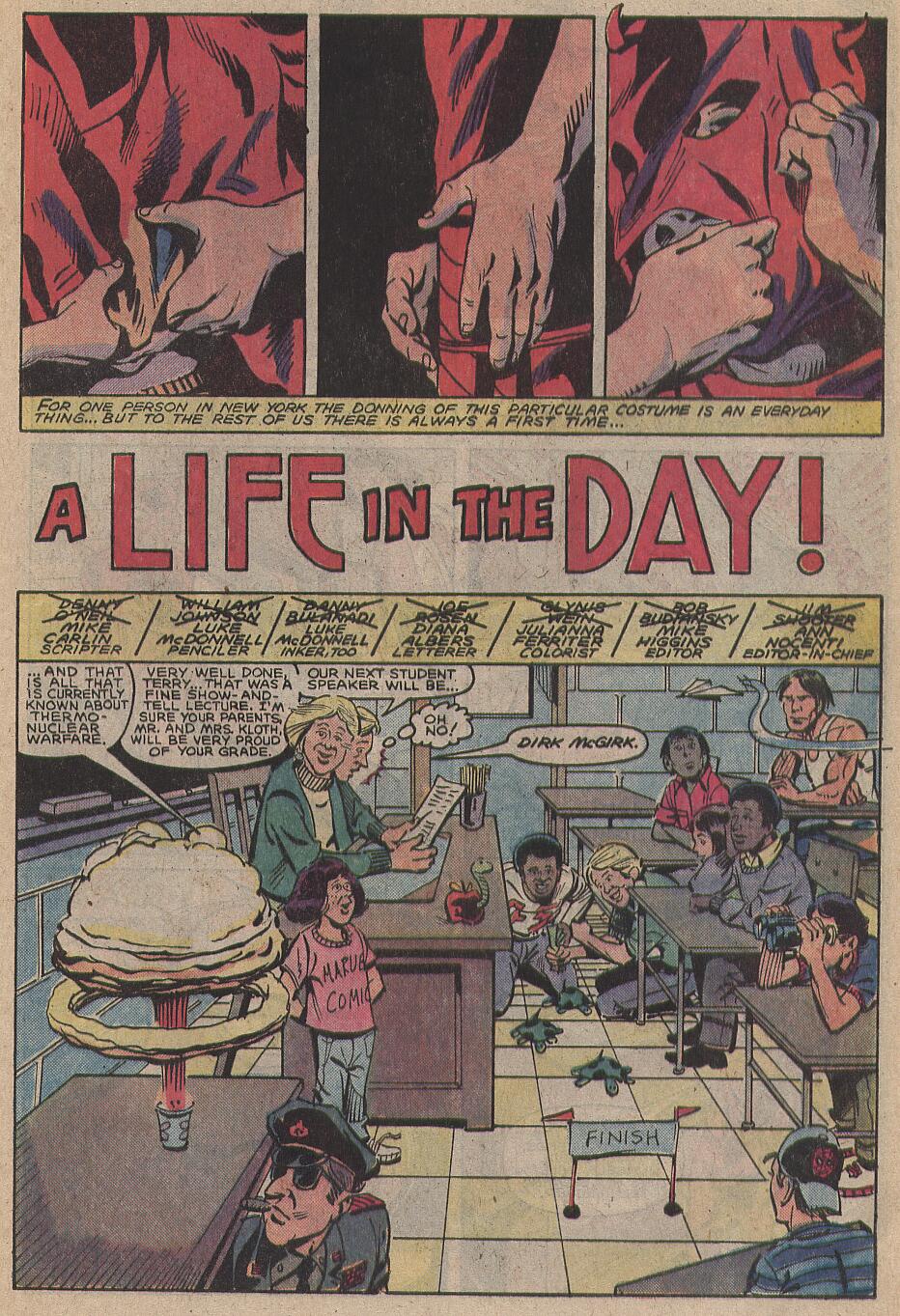 There is also a back up tale as part of assistant editors month, which was a line-wide month long event, showcasing more off-beat and silly stories, the idea being that you could blame the assistant editor and not the editor. This one, by Mike Carlin and Luke McDonnell, had a young boy Dirk McGirk, doing show and tell at school as the ‘Daring Devil’ who goes on to tell the class about his costumed career, getting all the names wrong and aggravating his teacher Miss Speld. As he finishes his tale, the real Daredevil punches his old sparring partner Turk through the school window. The kids surround Turk and Daredevil comes and retrieves him, thanking the school kids for their help. A furious Miss Speld thinks that McGirk has set the whole thing up and tells the class that school is dismiss due safety concerns. McGirk can say nothing, after meeting his hero, but the rest of the class, given the rest of the day off haul him to their shoulders and cheer.