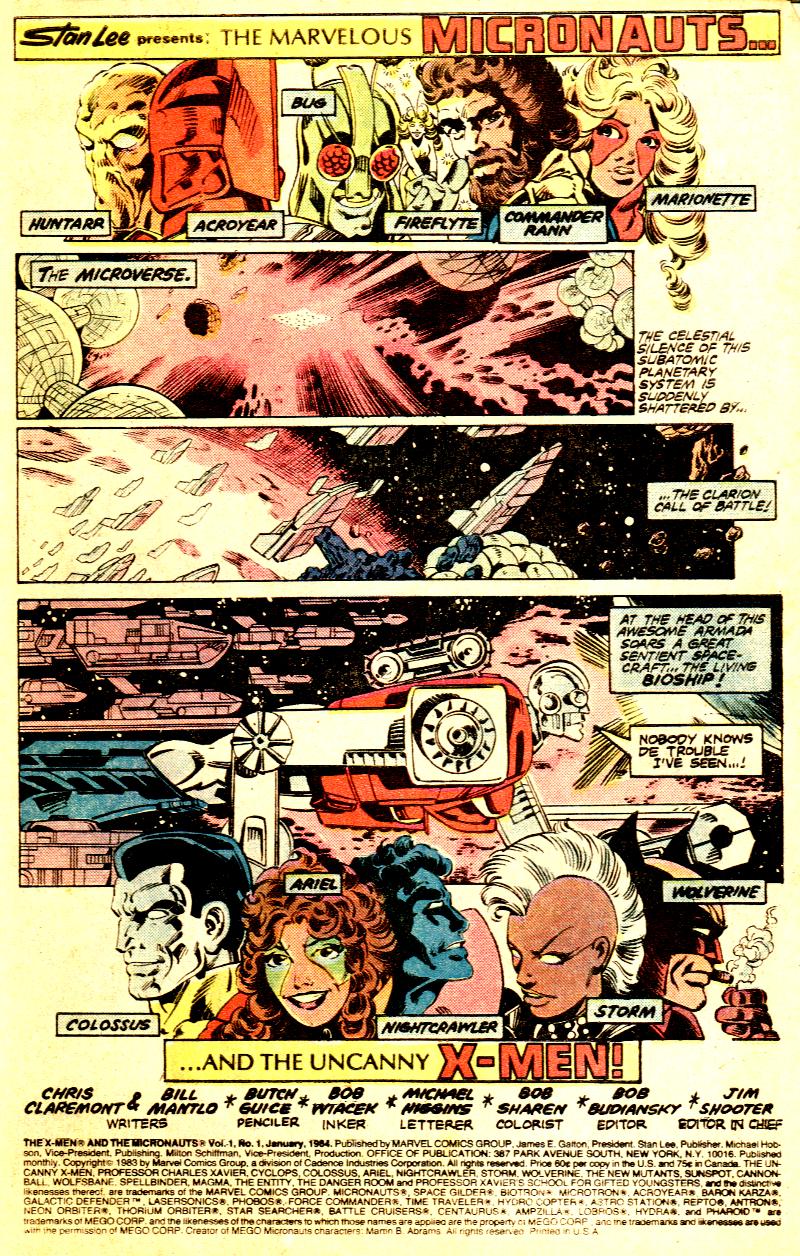 Synopsis: X-Men and the Micronauts 1 was written by Chris Claremont & Bill Mantlo with Butch Guice on pencils and Bob Wiacek on inks and opens with the Micronauts arriving at the wall separating the Microverse and the Macroverse at the head of a large space fleet. The Micronauts (Acturus Rann, Marionette, Bug, Huntaar, Fireflyte and Acroyear) are investigating a new threat to the Microverse, which has taken out whole worlds. One such world is the agrarian world of the D’Arnellians who attack the Microverse fleet, seemingly at odd with D’arnel’s peaceful history. We then find that the Micronauts are allied with the despotic Baron Karza in an effort to save the lives of all who live in the Microverse.