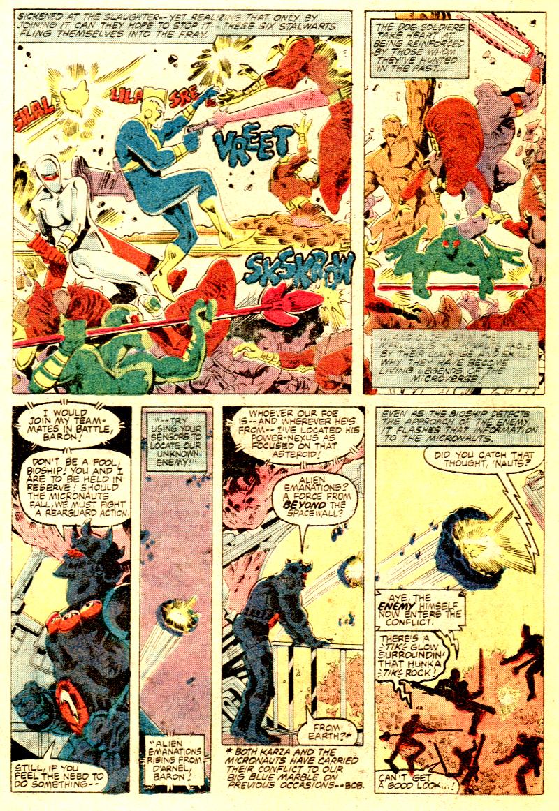 The battle doesn’t go well, their enemy, a masked warrior, states how he is doing all of this for no reason beyond fun and to illustrate his point, destroys D’arnel itself. This unknown adversary captures the Micronauts and decides to play with them for his own amusement, while Baron Karza flees in the Micronauts BioShip and quickly arrives in the Macroverse.