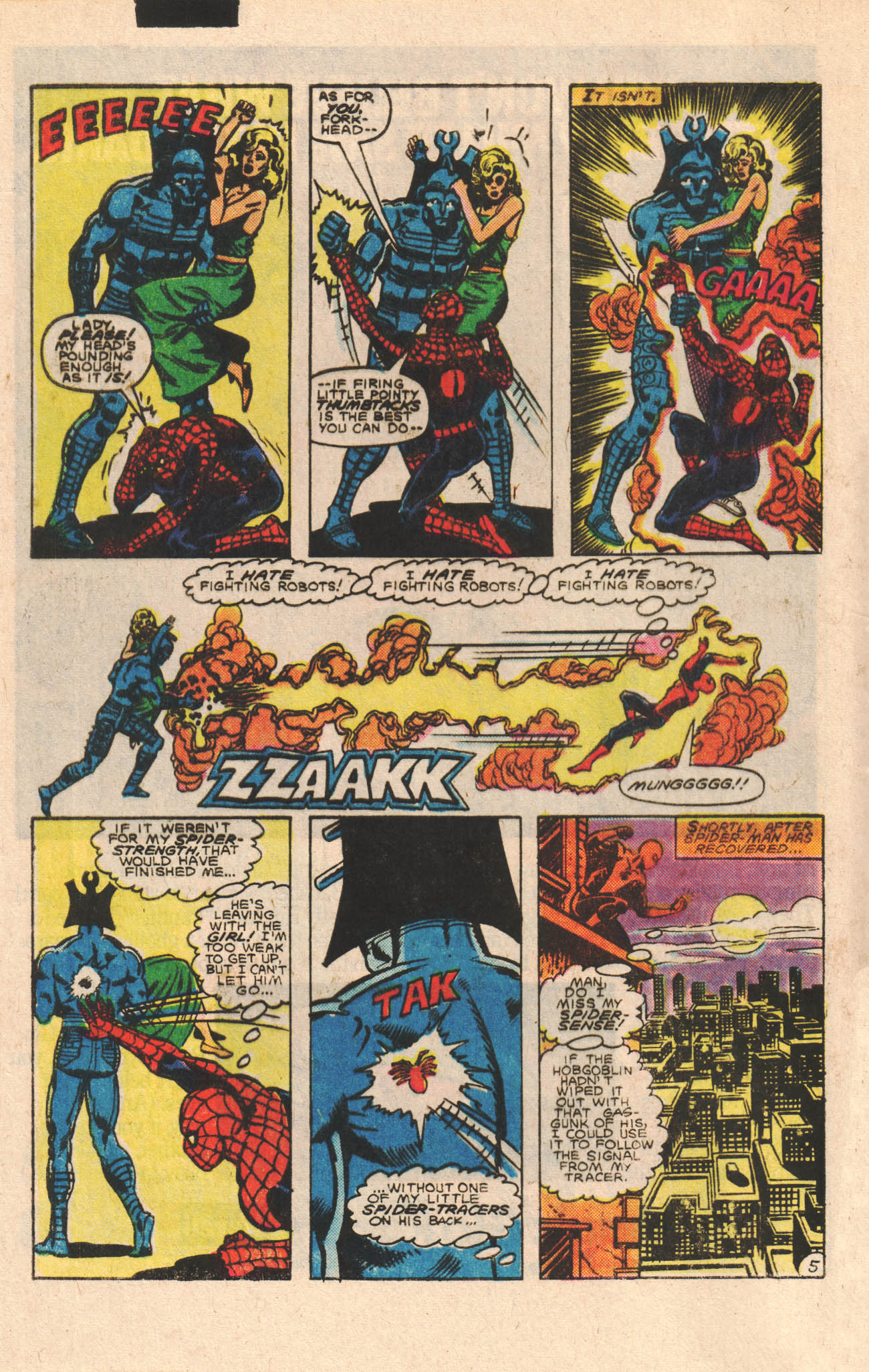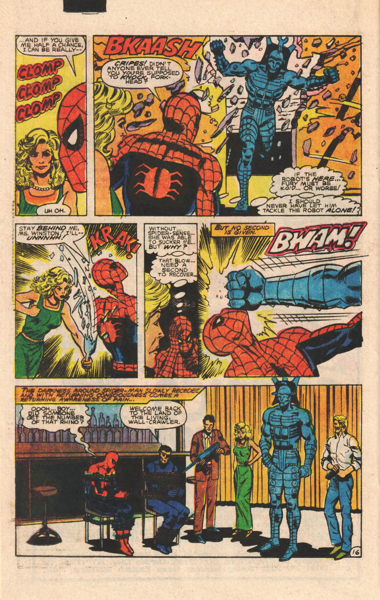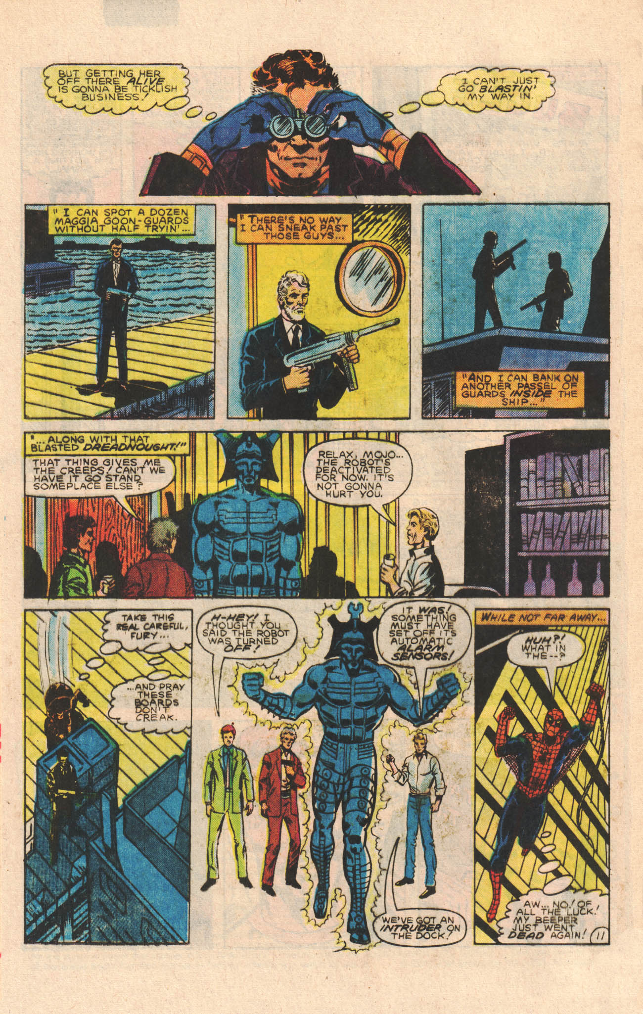Spidey changes to his Peter Parker identity to take pictures of Julie Winston, who has flown in from the West Coast to promote her Las Vegas revue show, now coming to New York. Peter is enjoying how low-hazard this job is, just as the Dreadnought breaks in and kidnaps Julie. Peter as Spider-Man appears and tries to battle the Dreadnought and doesn’t do too well, but does manage to put a tracer on the robot