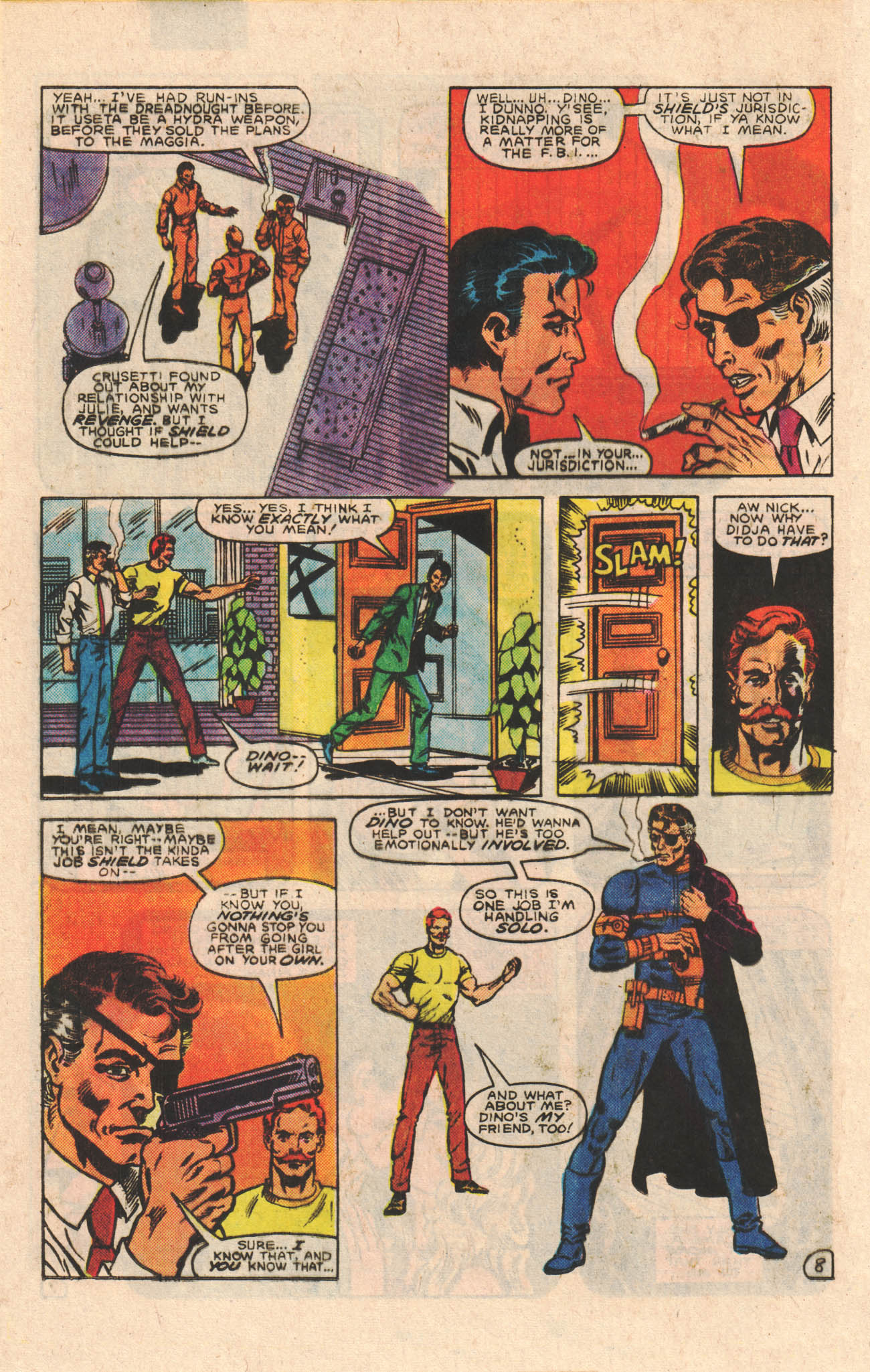 Elsewhere, S.H.I.E.L.D. (Supreme Headquarters International Espionage Law Division) Director Nicholas (Nick) Fury and Agent Timothy “Dum Dum” Duggan are driving to Nick’s home when they bump into former Howling Commando (Fury’s WWII squad) Dino Manelli, who after the second world war went back into showbiz and was singing in Vegas, when the venue he played at was taken over by Marcos Crusetti of the Maggia. Dino quit rather than work for organised crime and started to open his own hotel, when he met the aforementioned Julie Winston. The two eventually getting engaged. Hearing of the Dreadnought attack, he goes to Nick’s place to get his help. Nick points out that organised crime and kidnap cases are not what S.H.I.E.L.D. does and politely tells Dino they can’t help. Dino leaves, then Fury gets into his work outfit and goes out to investigate it on his own, with Dum Dum staying behind as back-up.
