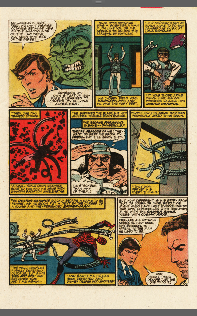 Driven by the desperation of a terrified husband and father, Reed agrees to ask him for his help and heads to the psychiatric hospital where he is being held. He talks to Otto, man to man, scientist to scientist. It works, reigniting the spark of good that was Otto Octavius. In a prison facility nearby, the mechanical arms taken from Otto when he was arrested start to move independently and seek out their owner. Halfway there, Otto see’s a picture of Spider-Man and feels unwell and the disembodied tentacles attack Reed. Otto is close to the arms and takes more direct control of them and is Doctor Octopus again.