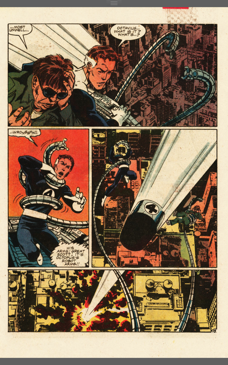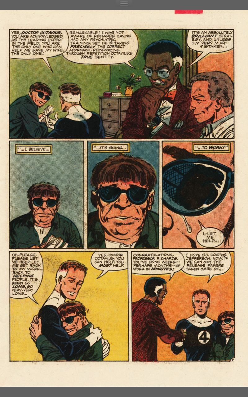 Reed manages to stop the arms working and pleads again for Otto to keep his word and help Sue. As a show of faith, he pulls back, giving Doctor Octopus control of his arms again as well as a chance to strike him. This works and the two make it back to the hospital. It doesn’t matter, Sue lost the baby half an hour earlier.