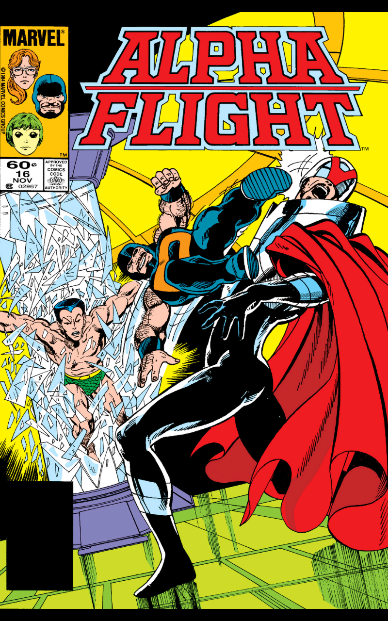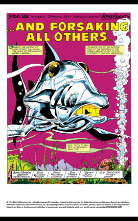 Synopsis: Alpha Flight 16 was written and drawn by John Byrne with finishes by Bob Wiacek and opens on a fish shaped submarine, which would not look out of place on the TV shoe Stingray. On board is the Master of the world, who has captured Eugene ‘Puck’ Judd as well as Marrina of Alpha Flight as well as Marrinna’s live Namor MacKenzie, Monarch of Atlantis. The ‘Master’ monologues about his survival after his last battle with Alpha Flight and his explaination of the origins of Marrina. We then see a more monstrous Martina in the grip of her mating instincts and the alien creature she seeks to mate with.