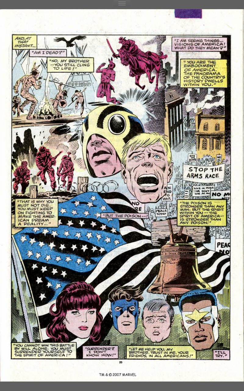 At the point of complete and total rage, Cap refuses to kill the Skull, who instead died in his enemy’s arms. After reaching the house that he saw blown up, Cap also succumbs. And now we have the WTF portion of the show, Black Crow appears, now dressed in a bizarre costume and also walking. He uses magic dust and a glowing spear to restore Cap to life after some navel gazing about the spirit of America and it’s connection to Cap. Nomad, Falcon and Bernie find Cap holding the dead body of the Skull and Cap tells them that he wants to bury the past for good.