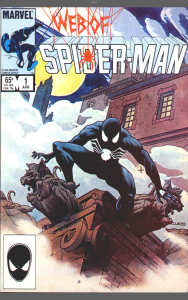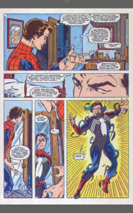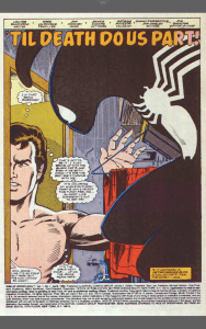 Synopsis: Web of Spider-Man 1, Til Death Do Us Part was written by Louise Simonson with art by Greg LaRoque and Jim Moony and opens with Peter Parker fishing in his wardrobe for his Spider-Man costume. which is next to a shapeless and shadowy creature that looks like his previous black costume. On the roof of Peter’s apartment building, models Bambi and Randi are trying to sunbath in autumn. The black shape changes into an exact duplicate of the more familiar red and blue Spider-Man costume, so Peter grabs it by mistake and puts it on. Internally he goes over a brief history of the alien costume, based on his concern that it has escaped the custody of Reed Richards of the Fantastic Four, knowing that there have been rumours of a black shape temporarily possessing random people. Peter decides to go and see Reed at the Baxter Building to ask about the costume only to realise he is wearing it.
