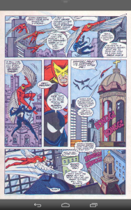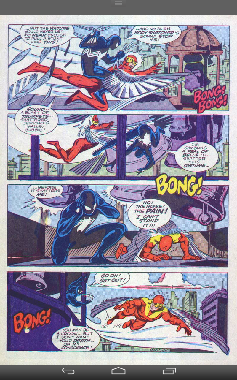 The sound of the bells is painful to all, the Vulturion escapes but the bells cripple Spider-Man and the costume, which at the cost of it’s life pulls Peter to safety.