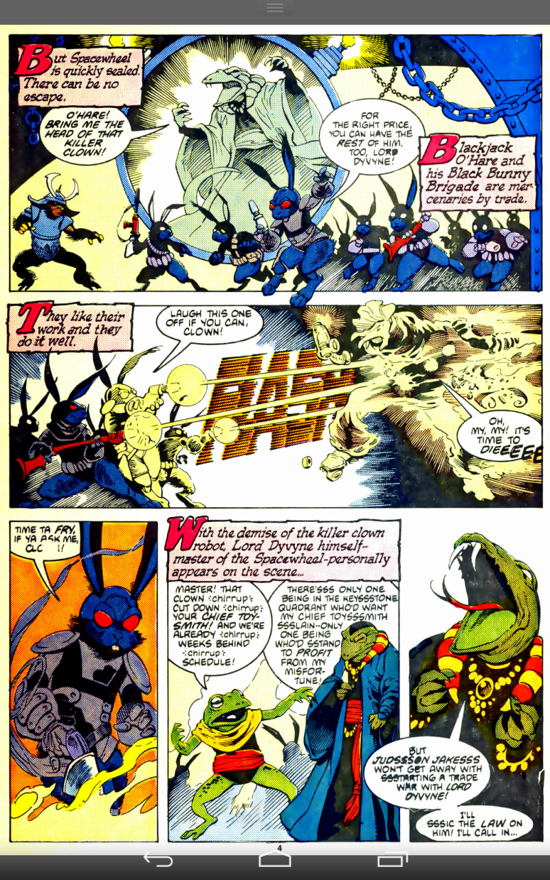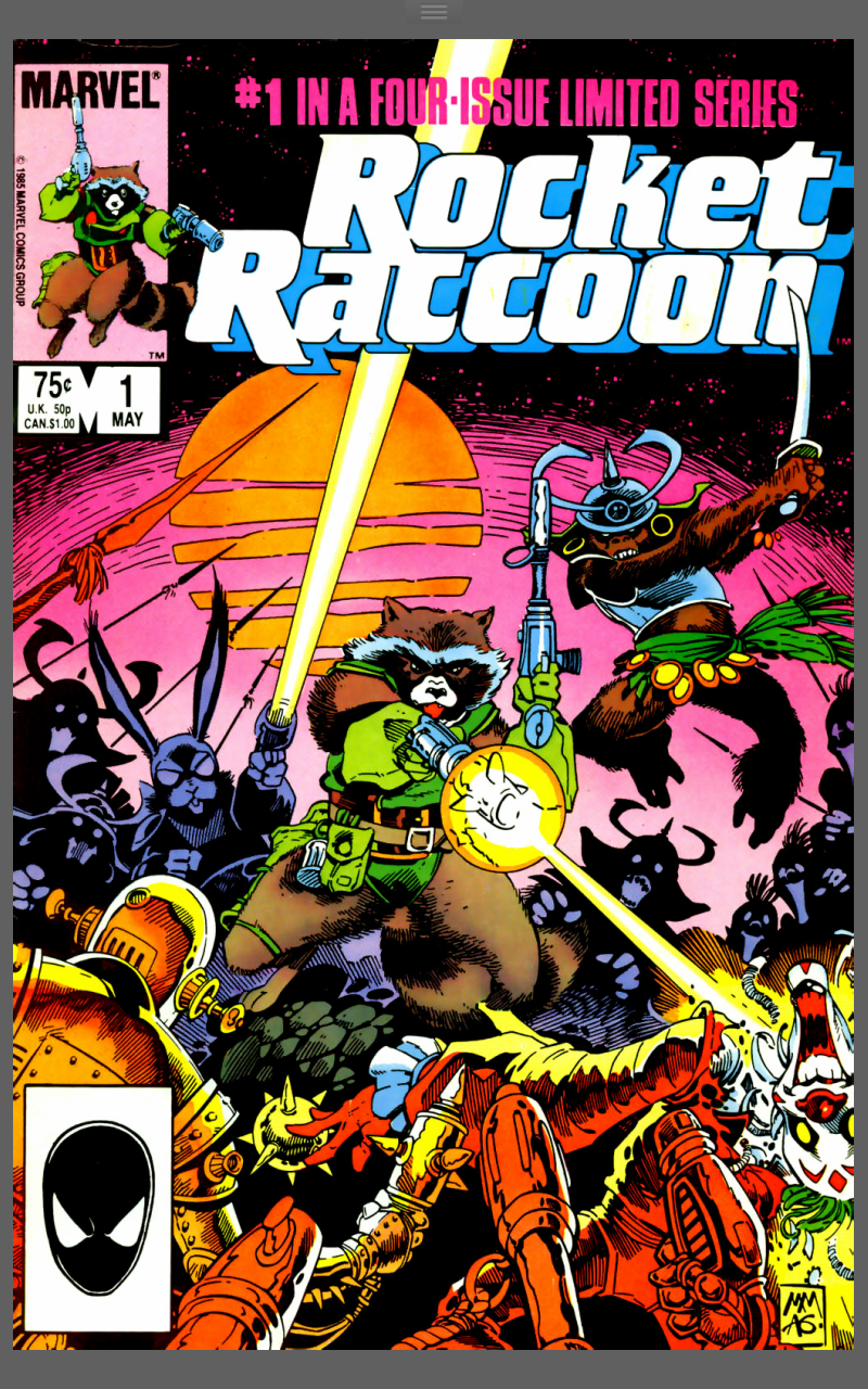 Synopsis: Rocket Raccoon 1 was written by Bill Mantlo, with art by Mike Mignola and Al Gordon and opens with the assassination of the Chief Toysmith of the Spacewheel. The assassin gets past the sentries and past the mercenaries sent after him by the head of the Spacewheel. The only thing is the toysmith is an iguana, the sentries are gorillas, the boss is a snake, the mercs are rabbits and the assassin is a clown. Welcome to Halfworld.