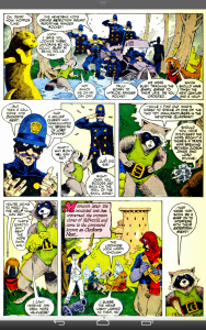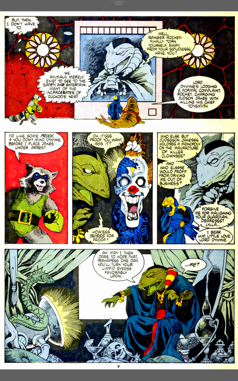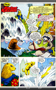 The head of Spacewheel, a creature called Lord Dyvynne, believes the attack comes from Judson Jakes, a business rival and to avoid a trade war with him, Dyvynne calls on the law, in this case the ranger known as Rocket Raccoon. Rocket himself is chilling out with his partner Wal-Rus (a walrus as you can imagine) and his beloved otter Llyla. Rocket is reading the Halfworld bible, but is soon pulled into fun and frolics by Llyla. Their revelry is interrupted by the ranger deputies, the Keystone Kops. They tell Rocket about what has happened on Spacewheel and Rocket heads out to put the bible back. He speaks with one of the ‘loonies’ the inhabitants of Halfworld, who Rocket and the rest of the animals see to the safety and entertainment of. He speaks to Lord Dyvynne and then goes after Judson Jakes, who is legal guardian of Llyla and through her controls Mayhem Mekaniks, who along with Spacewheel produce all the toys for the loonies for their entertainment. They both want the hand of Llyla to consolidate their power and to eradicate the other.