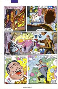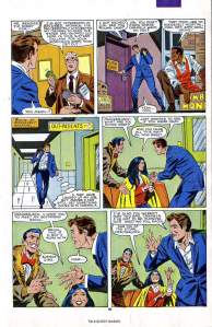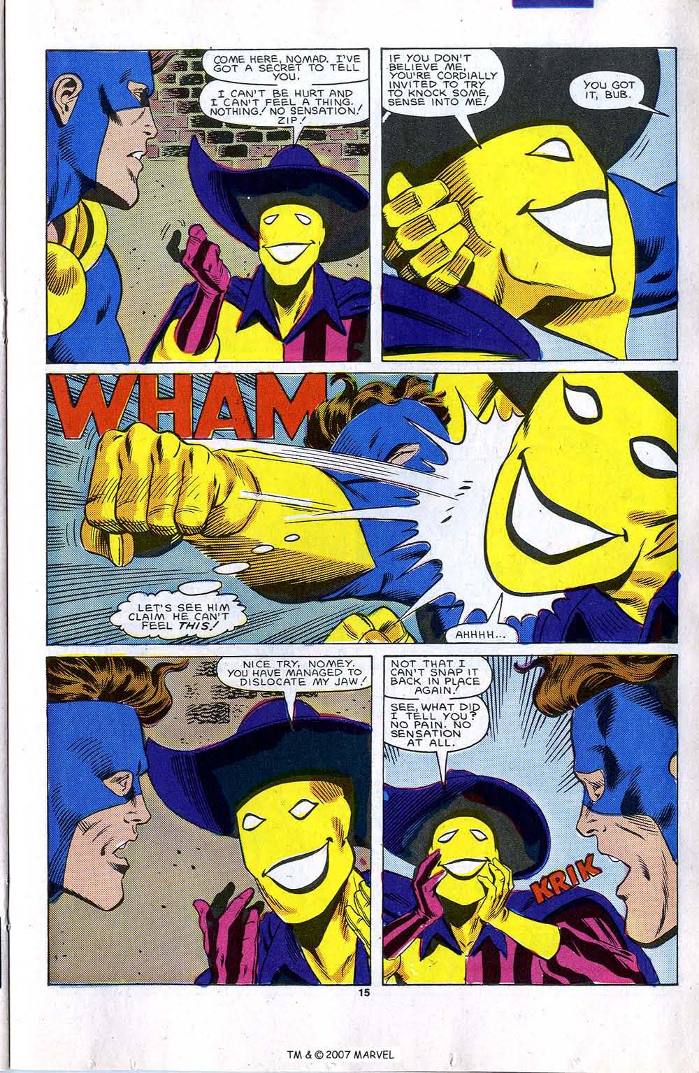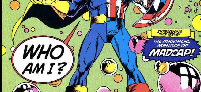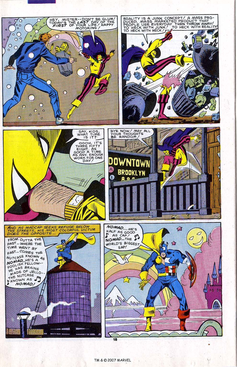 Later on we get to see that Bernie’s handblown glassware store is barely getting by and the landlord is about to hike up the rent 300%. Out on the street, our bubble gun man dressed in a colourful costume calling himself Madcap starts an insane riot in the middle of a nearby street. After shooting a policeman with his bubbles, Madcap is shot and yet seems to suffer no ill-effects, including pain or lasting damage. Back at his bag-boy job Jack is having fun flirting with cashier Carmela until the crisis outside bursts into the shop and Carmela is hurt. Jack is about to see what is going on, but his boss tries to stop him. Jack goes anyway and changes into his Nomad costume. He battles Madcap and acquits himself well, but with Madcap unable to feel pain and healing as fast as he is damaged, eventually Nomad is hit by the bubbles as well, going as mad as everyone else, which includes his hallucinating himself as half Nomad/half Captain America. By the time this fades, Madcap is gone and so is Jack’s job. He checks in with Carmela, long enough to meet her boyfriend Raoul and decides to go home and plan his pursuit of Madcap, who unbeknown to him is in the next train carriage on his subway ride home.