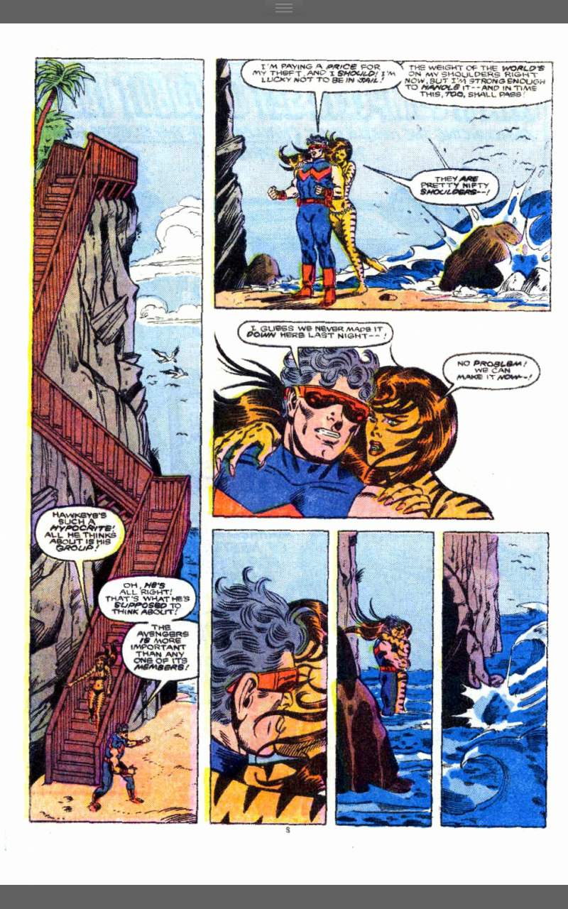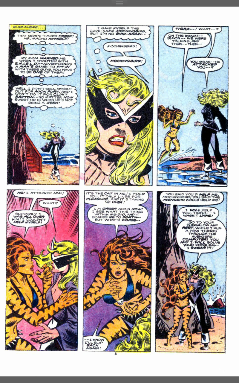 In a seperate room, Bonita ‘Firebird’ Juarez and Ben ‘The Thing’ Grimm are talking with the former super hero Doctor Henry Pym, just as the team holds an impromptu press-conference in support of Wonderman’s actions. Simon himself slinks off as soon as it’s done and heads to the beach, followed soon after by Tigra, who helps with his turmoil with a bit of seaside afternoon delight.