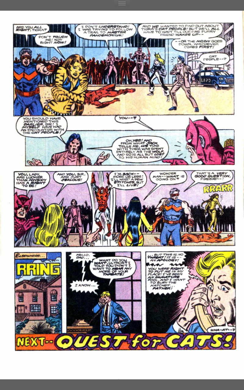 The strengths of this issue are it’s writing. One of the hallmarks of good serialised fiction is the ongoing melodramatic element. It’s why soap operas persist. This issue excels at that feature. The contentious marriage of Hawkeye and Mockingbird, Wonderman’s legal problems, Ultron calling his ‘father’ Hank Pym and Tigra sleeping with both Simon and Hank, not to mention Iron Man wanting some of that action in the creepiest thought balloon in that whole comic. Seriously though, the purring? Last Week I watched the 1966 Batman with my son, there’s a scene near the end on a submarine, where Catwoman was meowing like a real cat and one of Penguin’s goons ‘Bluebird’ had a very WTF look on his face. (BTW watch that film, it’s campy and bonkers fun) But here it’s apparently a turn on? Firebird wants on that team, but with these guys on it, not the best idea.