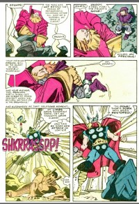 Synopsis: Sir! Was written and drawn by Walt Simonson and opens with Thor’s Chariot being pulled by the goats Toothgnasher and Toothgrinder and standing upon it is well a 6ft6 frog dressed as Thor.
