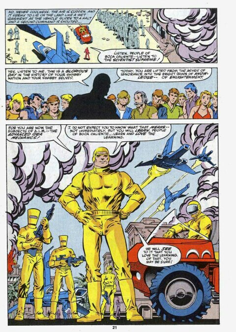 Elsewere, near the Artic Circle,, a member of the scientific terror group Advanced Idea Mechanics (or AIM) is imprisoned by his brothers in science. It’s not made explicit why the scientist supreme has imprisoned Yorgen Tykkio, but it’s most likely due to his megolamana as well as his designing of an orbital lens weapon marking him as a threat. The scientist supreme tells Yorgen of his plan to conquer Boca Caliente, which Yorgen dismisses as a waste of a weapon that can level cities. He’s left in the cell, but with his next meal comes a hidden means of escape.