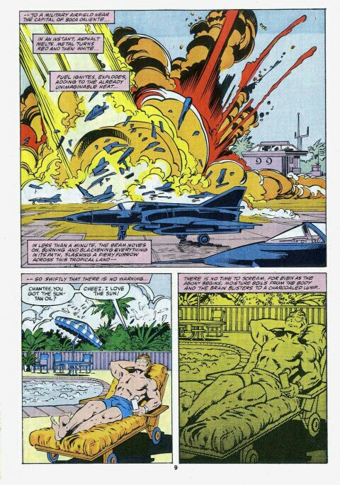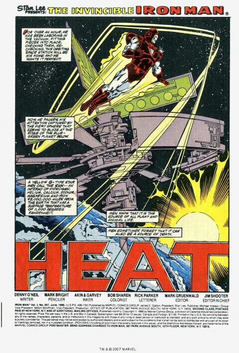 Synopsis: Heat was written by Denny O’Neil with art by Mark Bright, Atkin and Garvey and opens with Tony ‘Iron Man’ Stark (in full Silver Centurion armour) finishing construction of an orbiting space station, pleased with his handiwork. Also pleased is an un-named general from the Caribbean nation of Boca Caliente (you read that right, the nation is called Hot Mouth) who is meeting an un-named businessman on his yacht. The unsuspecting general is shot by the businessman who having financed the overthrow of the local government, wants to enjoy the fruits of that labour.